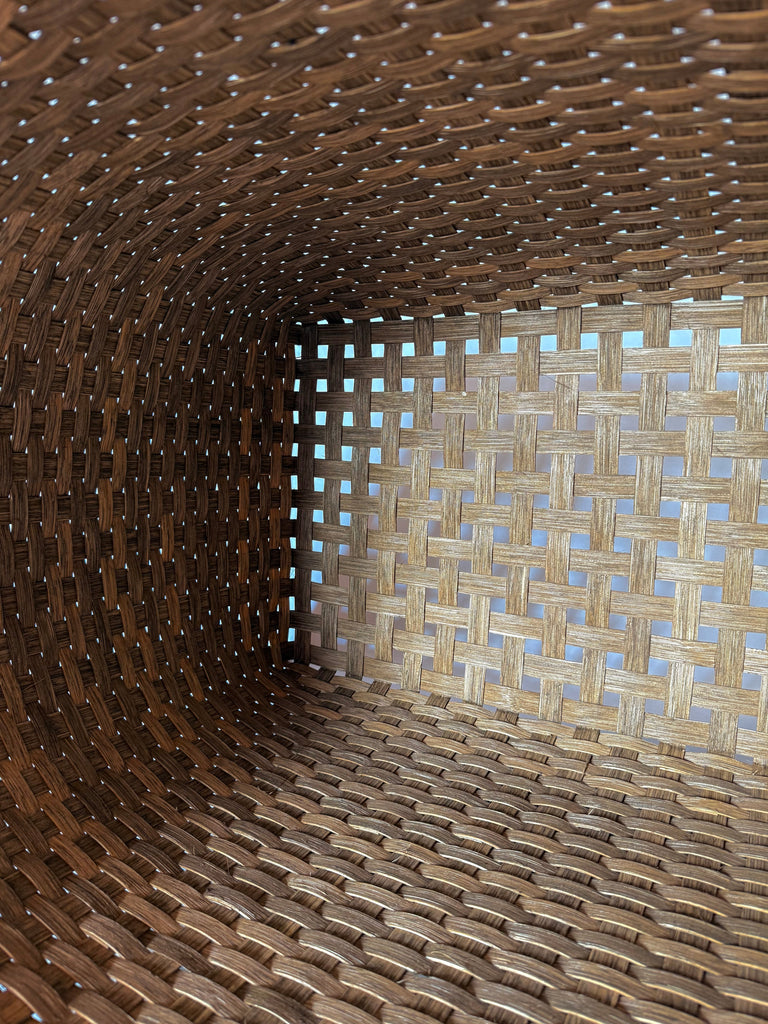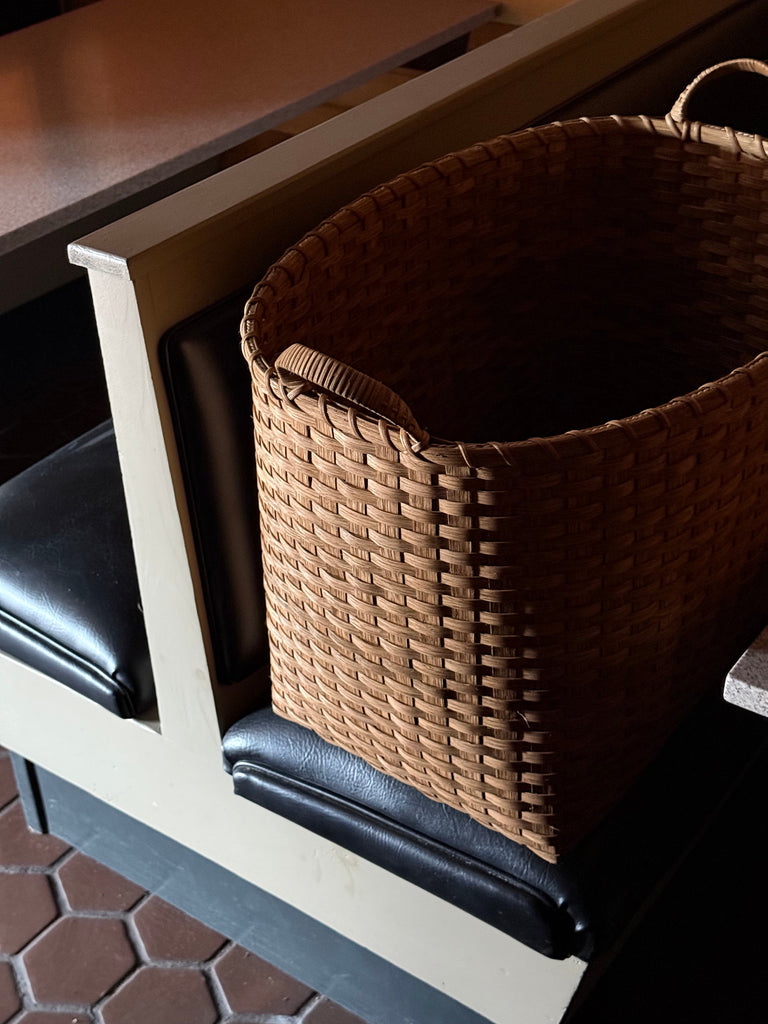 100% rattan core, an abundant climbing palm grown in Southeast Asia and sourced through longtime local partners. Non-toxic, organic natural dyes and finishes approved by the Consumer Product Safety Commission. Designed and hand-crafted by Erin and Peggy Pollard with a small team of weavers in Maine and New York. Finished in the Maine studio. Natural color variations will occur. Made in USA. Due to the freehand nature of the weaving process, each basket is one-of-a-kind and may vary slightly in shape and size.