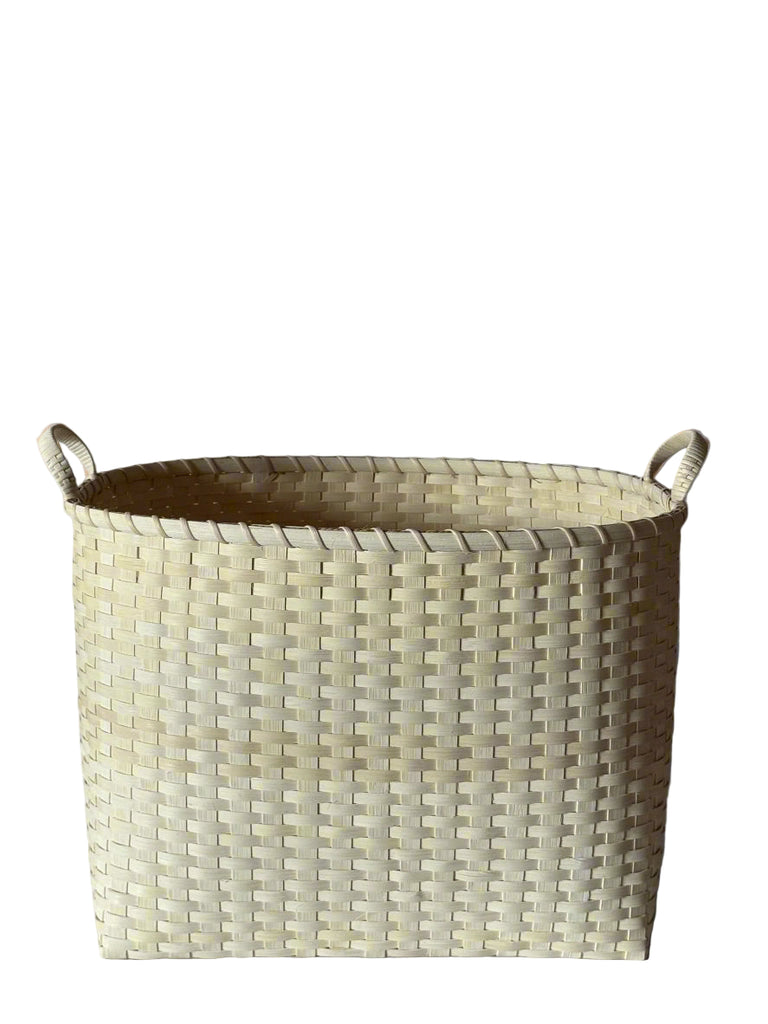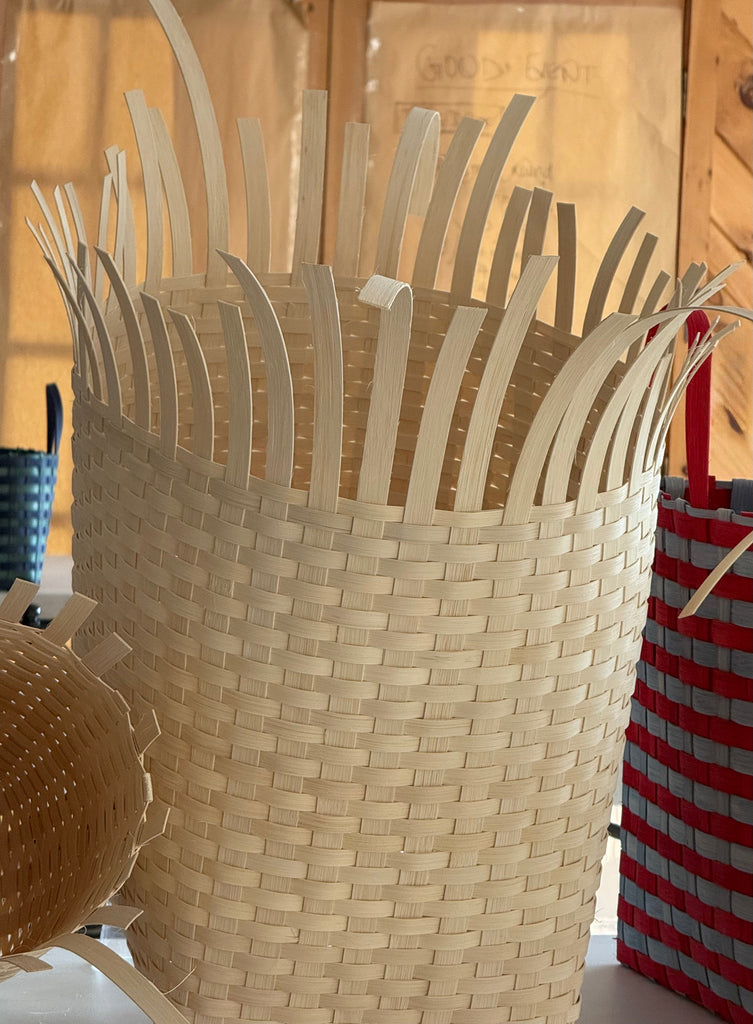 100% rattan core, an abundant climbing palm grown in Southeast Asia and sourced through longtime local partners. Non-toxic, organic natural dyes and finishes approved by the Consumer Product Safety Commission. Designed and hand-crafted by Erin and Peggy Pollard with a small team of weavers in Maine and New York. Finished in the Maine studio. Natural color variations will occur. Made in USA. Due to the freehand nature of the weaving process, each basket is one-of-a-kind and may vary slightly in shape and size.