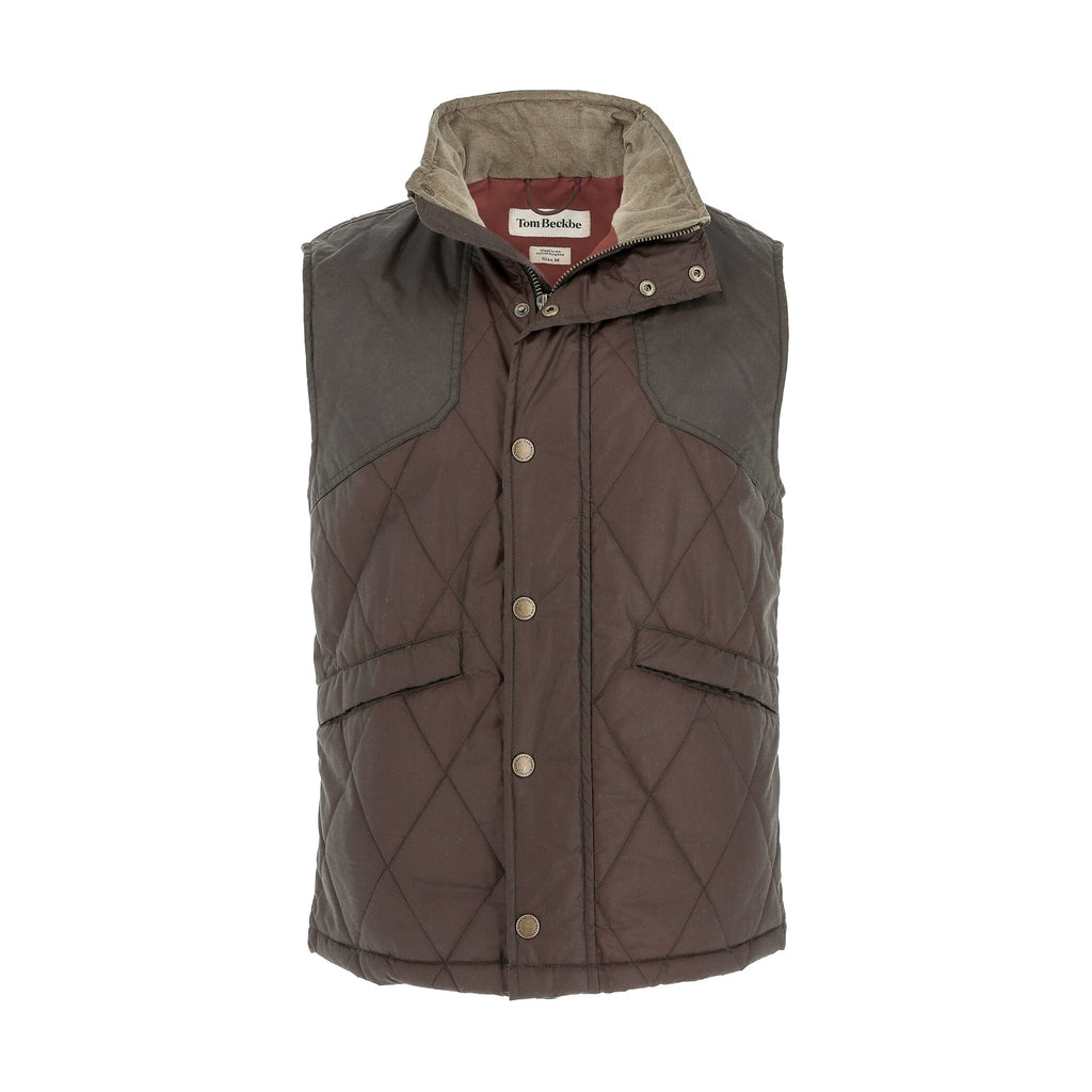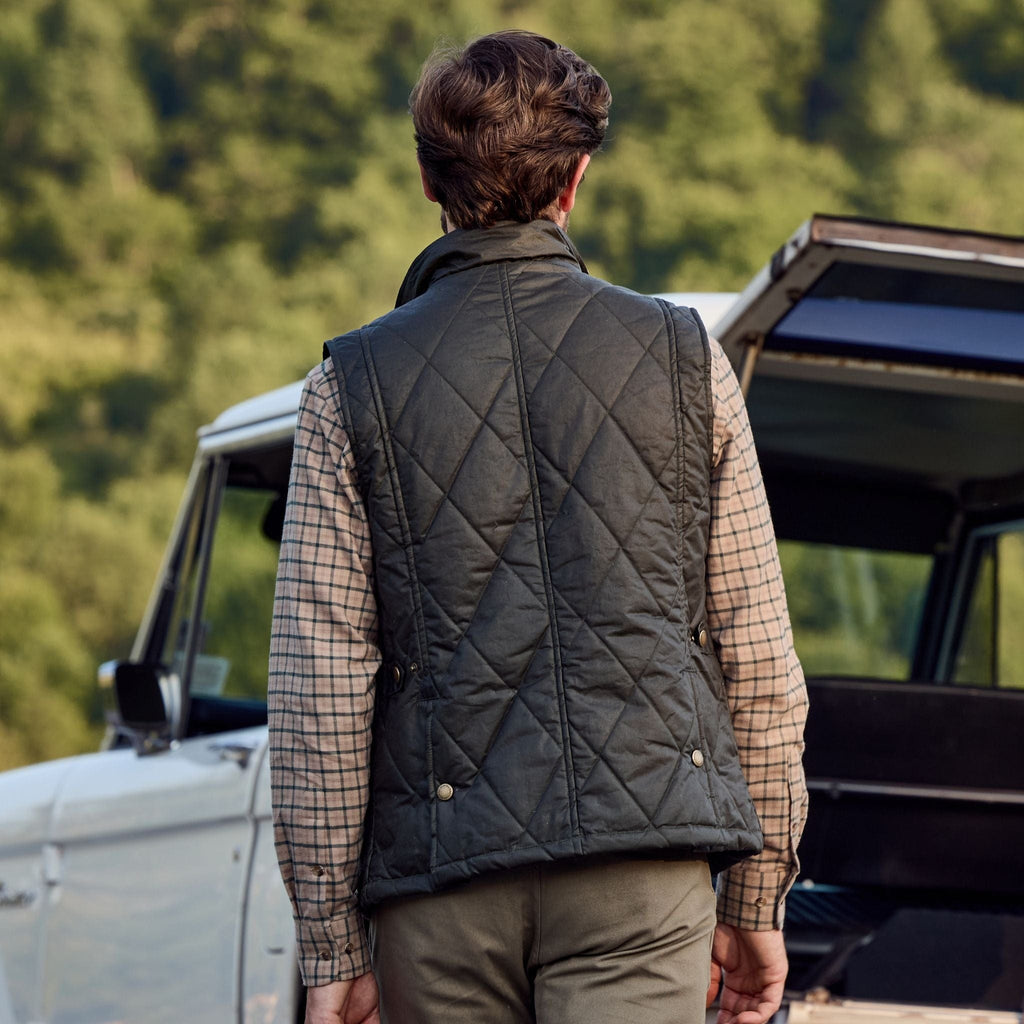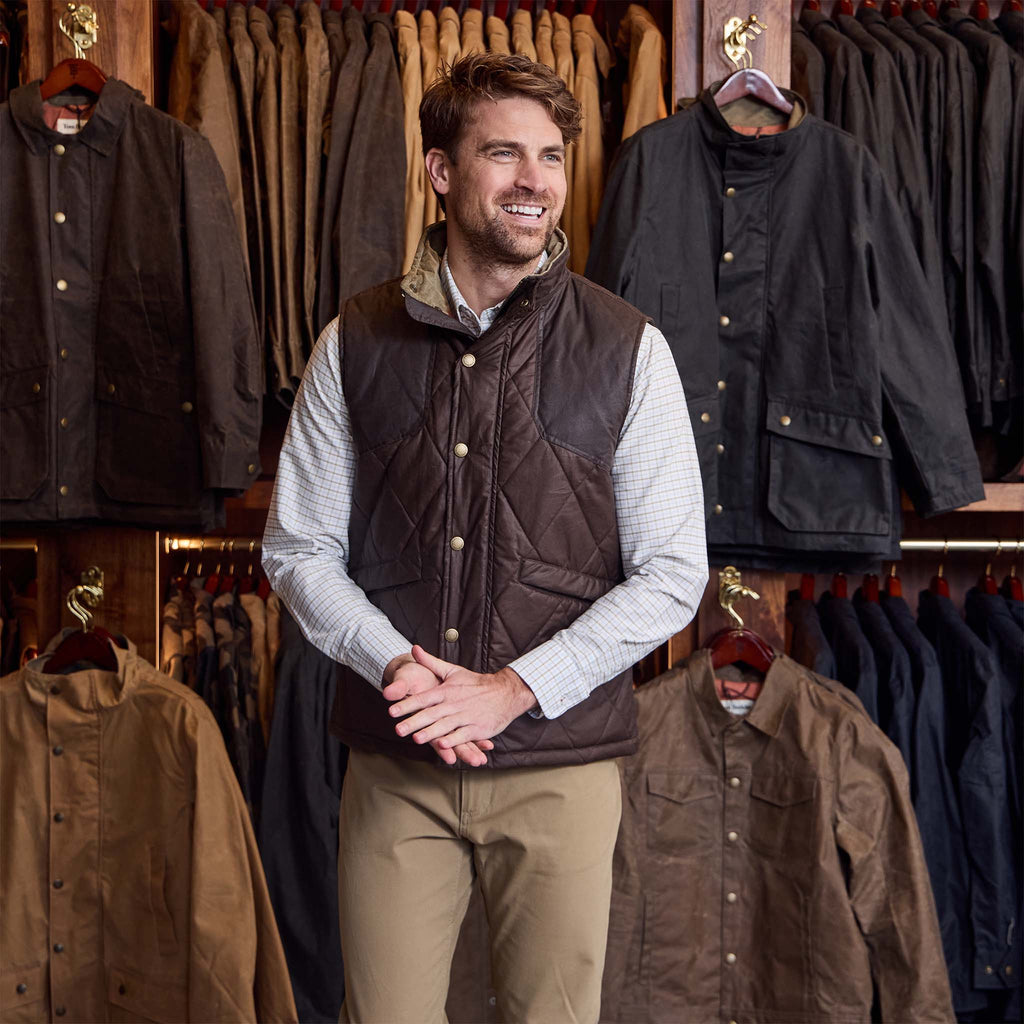 The Paddock Quilted Vest is the latest addition to Tom Beckbe’s collection of weatherproof waxed cotton vests for men. Designed for warmth, durability, and everyday versatility, this quilted vest is insulated with HD Wool—a revolutionary, naturally breathable material composed of 75% wool and 25% compostable biopolymers. Purpose-built for cold-weather comfort, the Paddock delivers the same rugged reliability and refined style that define Tom Beckbe outerwear. Crafted from a 5.5-ounce waxed cotton shell produced by the legendary Halley Stevensons mill in Scotland, the Paddock features a high-luster alchemy wax finish that offers weather resistance without the oily residue. Over time, it will develop a rich patina unique to its wearer. The oversized front handwarmer pockets are lined in soft moleskin and secured with concealed snaps for added protection from the elements. Inside, three pockets—including one with a secure zipper closure—provide thoughtful organization for essentials. A cotton liner inspired by Alabama red clay adds a distinctive touch, while a corduroy-lined collar stand and adjustable snap-tab waist ensure a comfortable fit. Finished with antique brass hardware, a two-way front zipper, and side vents for ease of movement. Available in Rye Brown, Olive, Tobacco, and Rustic Brown.