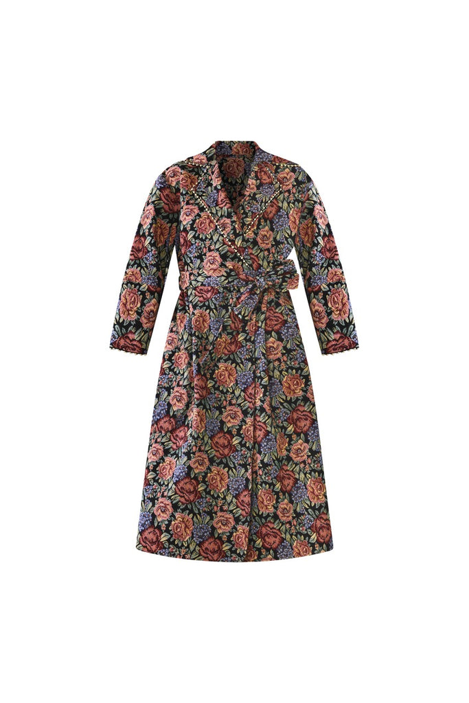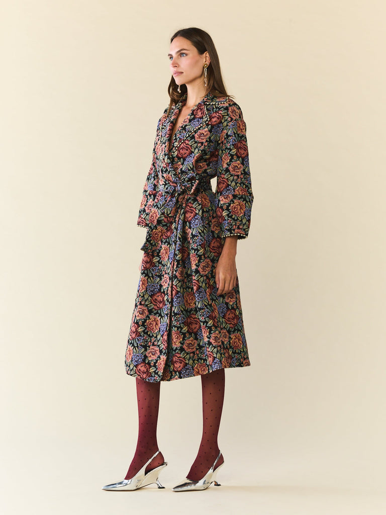 Floral jacquard fabric in rose, indigo, and marigold tones. Wrap silhouette with matching tie belt. Softly structured shawl collar. Midi length. Beadwork trim along collar and cuffs. Black Rainbow colorway. Made in India.