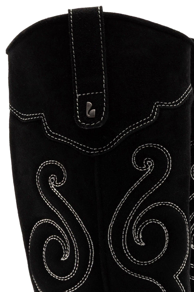 Bold colors, playful patterns, and chic silhouettes are hallmarks of Larroudé, a shoe brand born of the pandemic from industry veterans and husband-and-wife team Marina and Ricardo Larroudé. Manufactured in Brazil, Larroudé shoes are designed with the consumer and community in mind, never compromising on style, fit, and quality. The Paloma Boot in Black Suede redefines the Western classic with contemporary edge. Crafted from plush black suede with hand-stitched embroidery, its sleek paneling, pointed toe, and low stacked heel make it the ultimate blend of timeless craftsmanship and modern attitude.