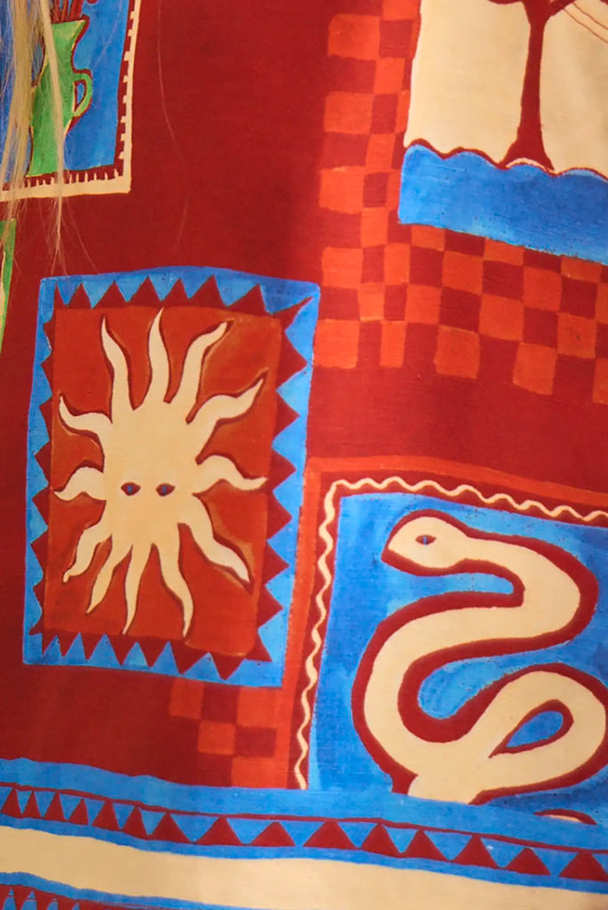 53% linen, 47% rayon. Signature HB Sante Fe print. Straight midi-length wrap silhouette. Interior button closure. Side self-tie. 34" length from top of waistband.