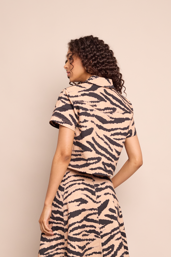 Founded by three New York City-based mothers who met through their kids, Cara Cara’s hallmarks include crisp poplin, house-designed prints, and casual glamour. The inspiration for their ethical womenswear comes from interior design, as well as the world’s most exotic locales. The Paro Top in Zebra Blush reimagines the classic button-down with a bold printed cotton canvas and a relaxed, boxy fit. Front and back yokes with topstitch detailing add structure, while flap pockets with signature gold snaps bring a polished finish. Side slits and cuffed short sleeves lend ease to this versatile warm-weather staple.