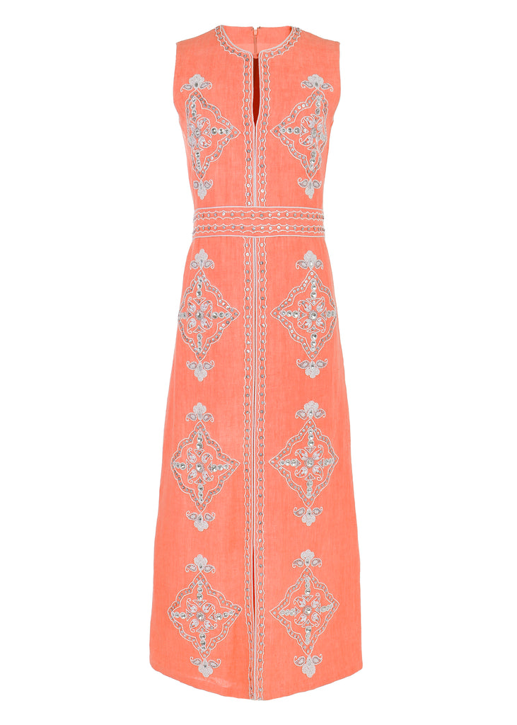 The OTM Exclusive: Beaded Clara Dress in Coral is an elevated statement piece, crafted in airy linen and adorned with intricate hand-beaded clover motifs. Designed with a fluid silhouette, front slit, and tie-back detail, it balances artisanal craftsmanship with effortless elegance.