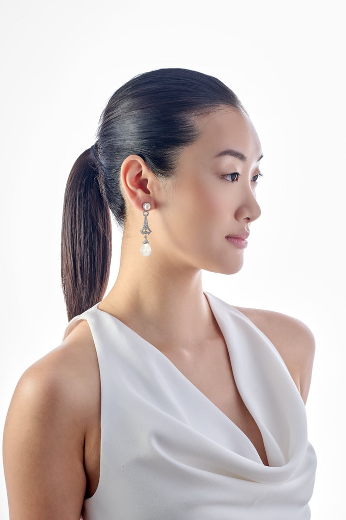 London-based Anabela Chan’s background in architecture and luxury fashion led to the first fine jewelry line to champion laboratory-grown gemstones. Today, its artisanal craftsmanship and sustainable innovations have found a place in the collections of royals, Rihanna, Taylor Swift, and sophisticated women worldwide. Designed for the Anabela Chan x Moss Sohee SS25 Haute Couture Collection, the Pearl Lattice Earrings balance modern geometry with timeless elegance. Crafted in rhodium vermeil with 14K gold posts and butterfly backs, this chandelier-style pair is intricately hand-set with cultured freshwater pearls, synthetic ivory drops, and 182 round brilliant-cut laboratory-grown simulated white diamonds.