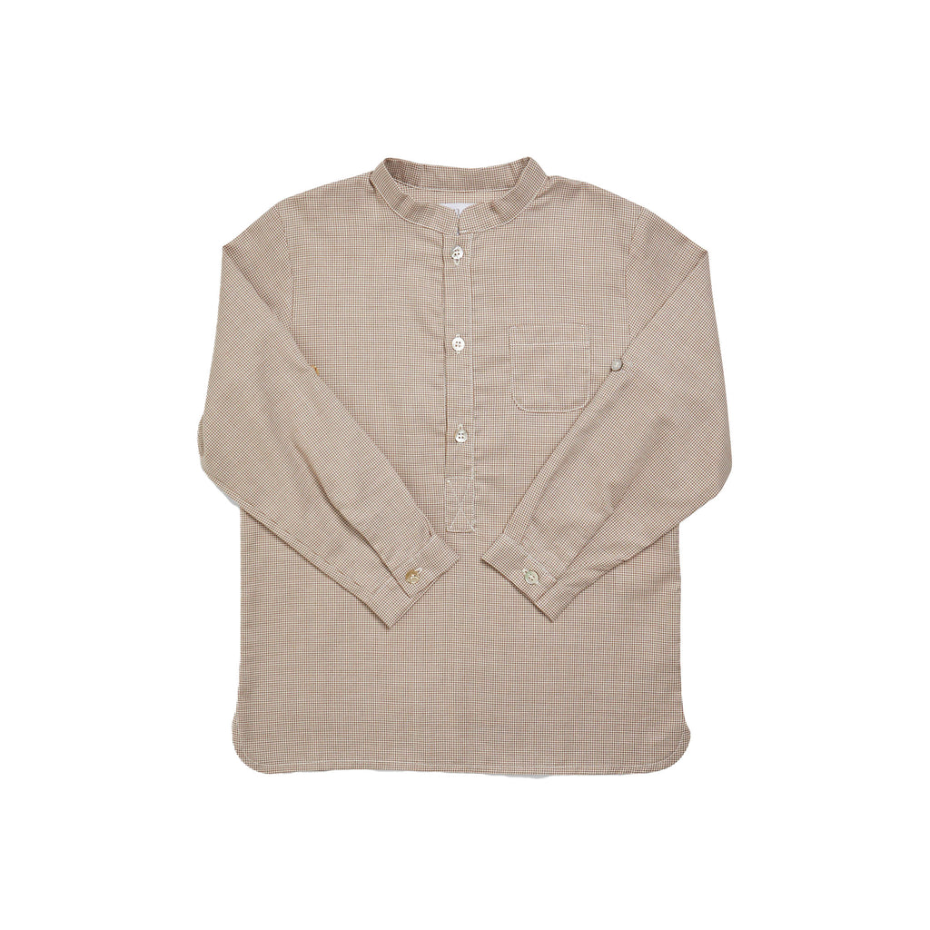 Soft cotton in brown and black check. Long sleeves with button cuffs. Mandarin collar. Front placket with mother-of-pearl buttons. Made in Spain.