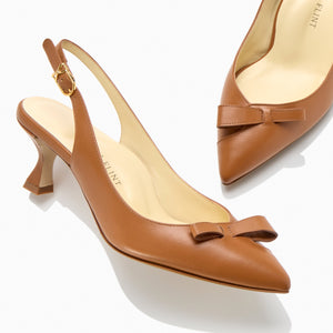 Sarah Flint sources the most exceptional materials from triple-dyed Italian suedes to jacquards woven in 300-year-old British mills. And once crafted 100% in Italy, shoes go through rounds of prototyping and fit-testing to ensure comfort and durability. The Perfect Natalie Sling 50 in Cognac Calf is a sling-back kitten heel topped with an asymmetrical bow and packed with comfort-driven features like anatomical arch support and extra footbed padding.
