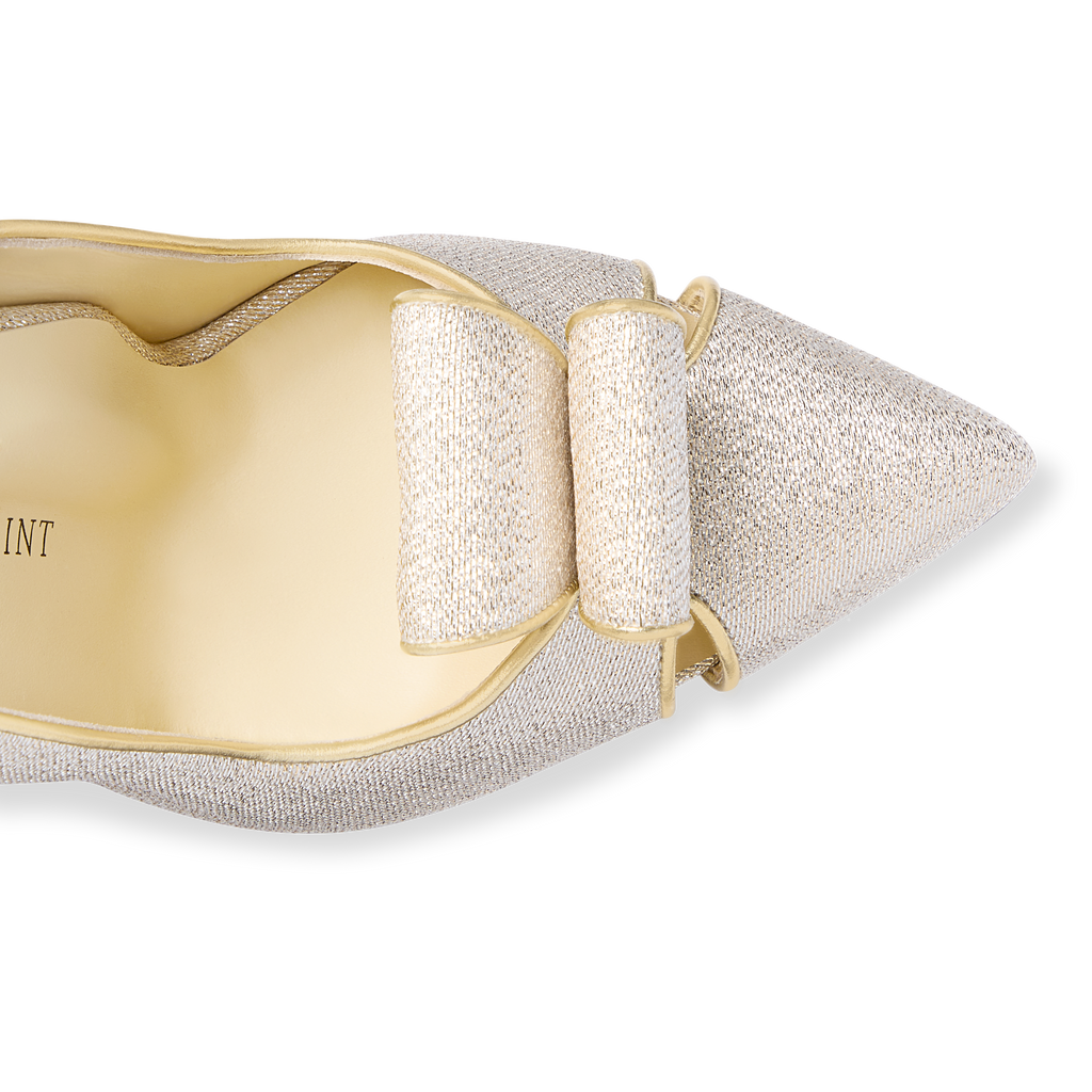 Two-tone metallic lamé. Italian nappa binding. Leather lining and insole. Leather outsole with full rubber forepart.