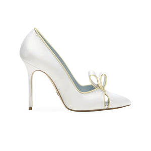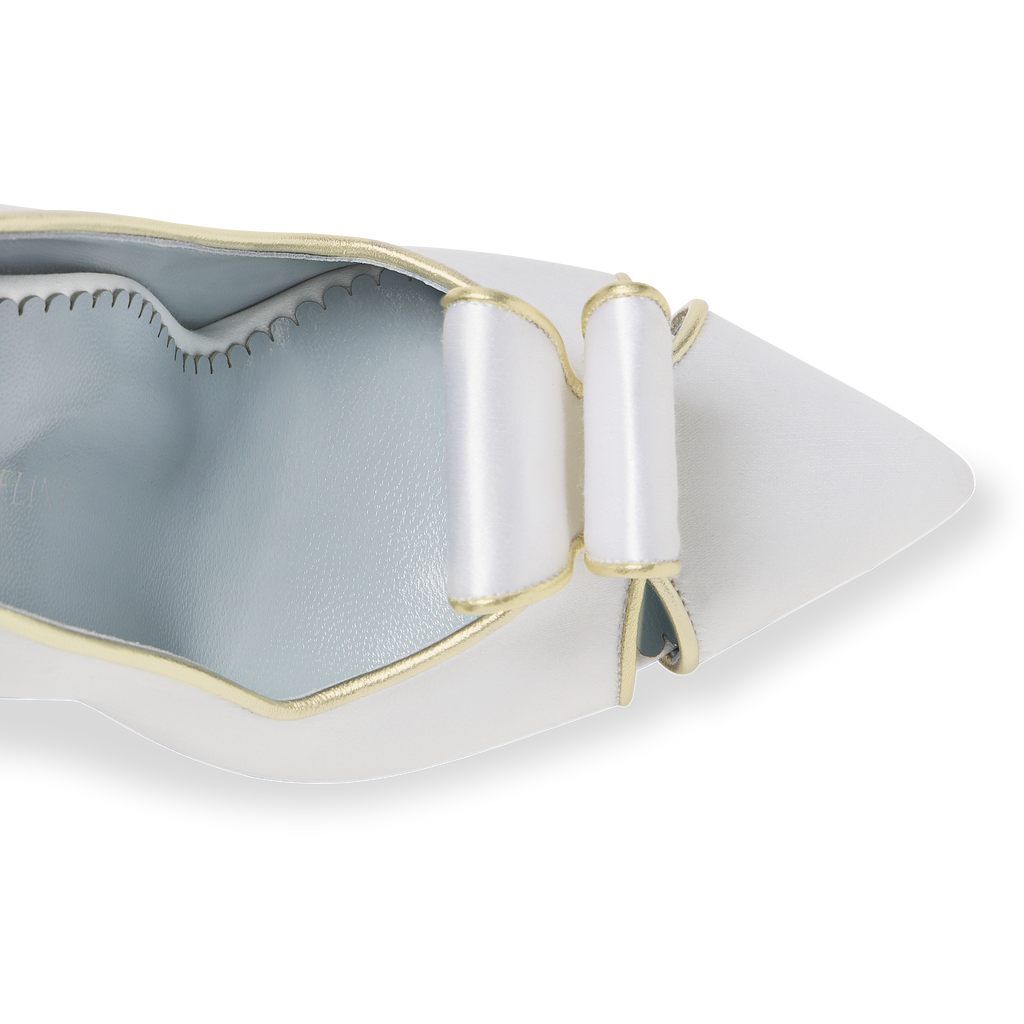 Sarah Flint sources the most exceptional materials from triple-dyed Italian suedes to jacquards woven in 300-year-old British mills. And once crafted 100% in Italy, shoes go through rounds of prototyping and fit-testing to ensure comfort and durability. The Nina is a standout pump heel in white satin, topped with an asymmetrical bow.