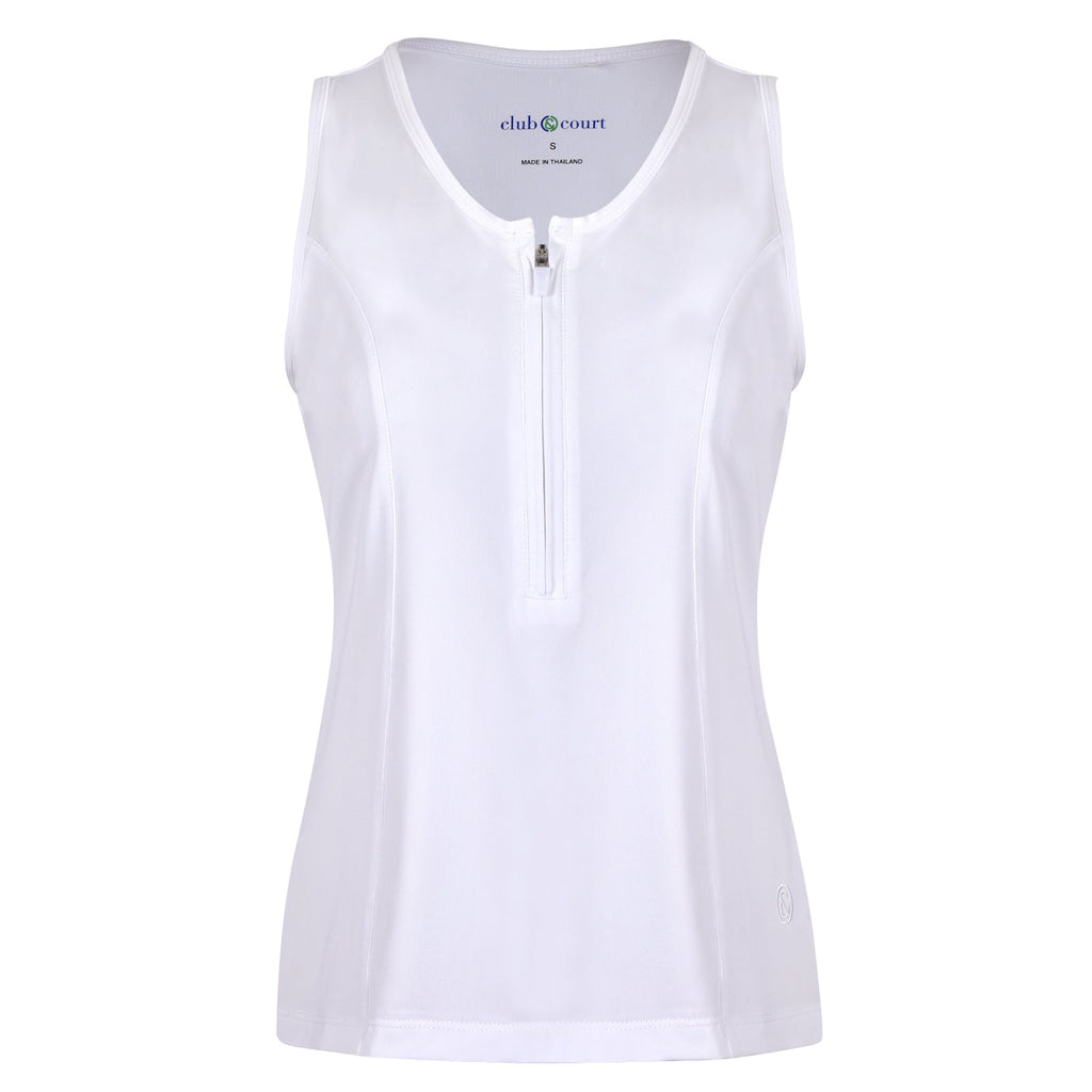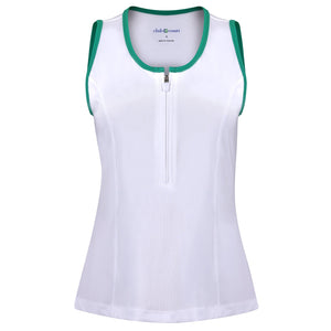 Taking inspiration from vintage tennis fashion, Club & Court employs modern fabrics and silhouettes, as well as a soft palette and bold prints to produce sporting attire, skirts and dresses that accommodate and elevate an active lifestyle. The Performance Tank is designed in performance polyester with a sleek half-zip, princess seams, and racerback styling for a sculpted, athletic silhouette. Available in Bright White or Bright White with Kelly Green Trim, this versatile top offers UPF protection and pairs effortlessly with the Pleated or Cricket Skorts.