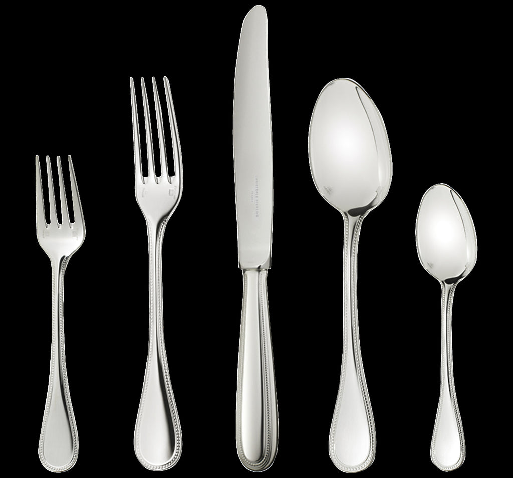 925 sterling silver. Includes dinner fork, dinner knife, salad fork, place soup spoon and teaspoon. Beaded border in half-relief. Gift boxed.