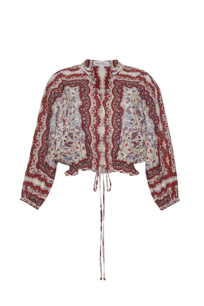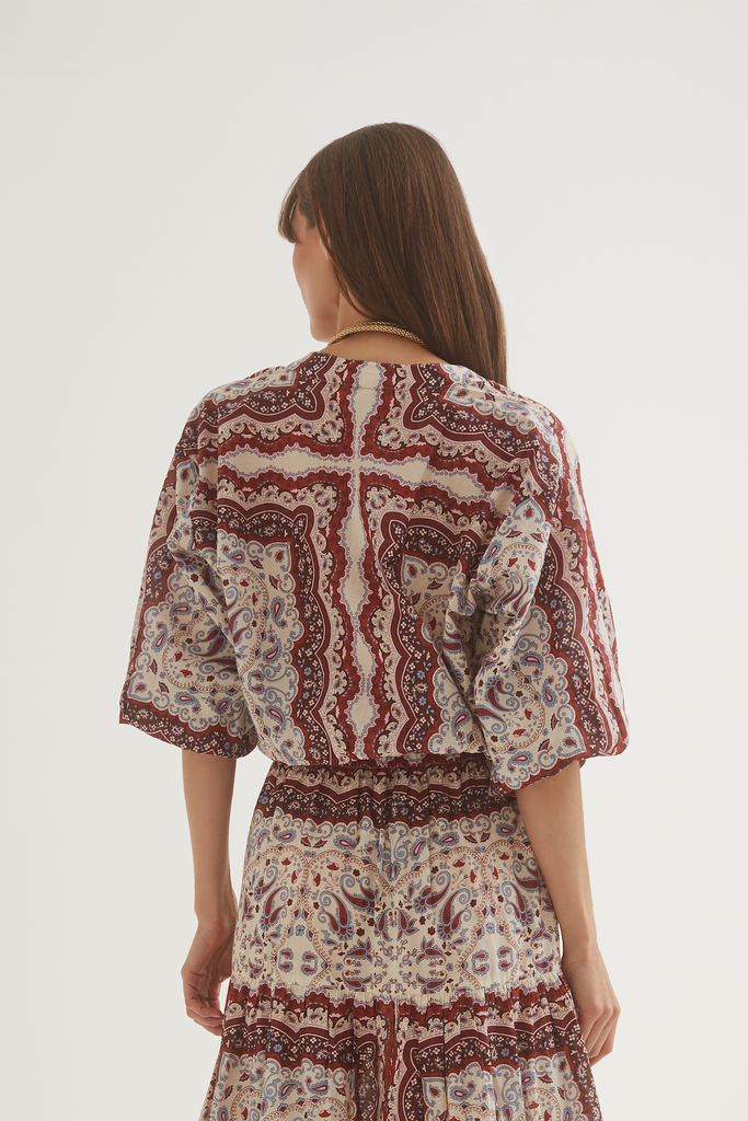Oversized cropped top in lightweight cotton voile. Placed paisley print. Adjustable drawstring ties at hem for customizable fit. Unlined.