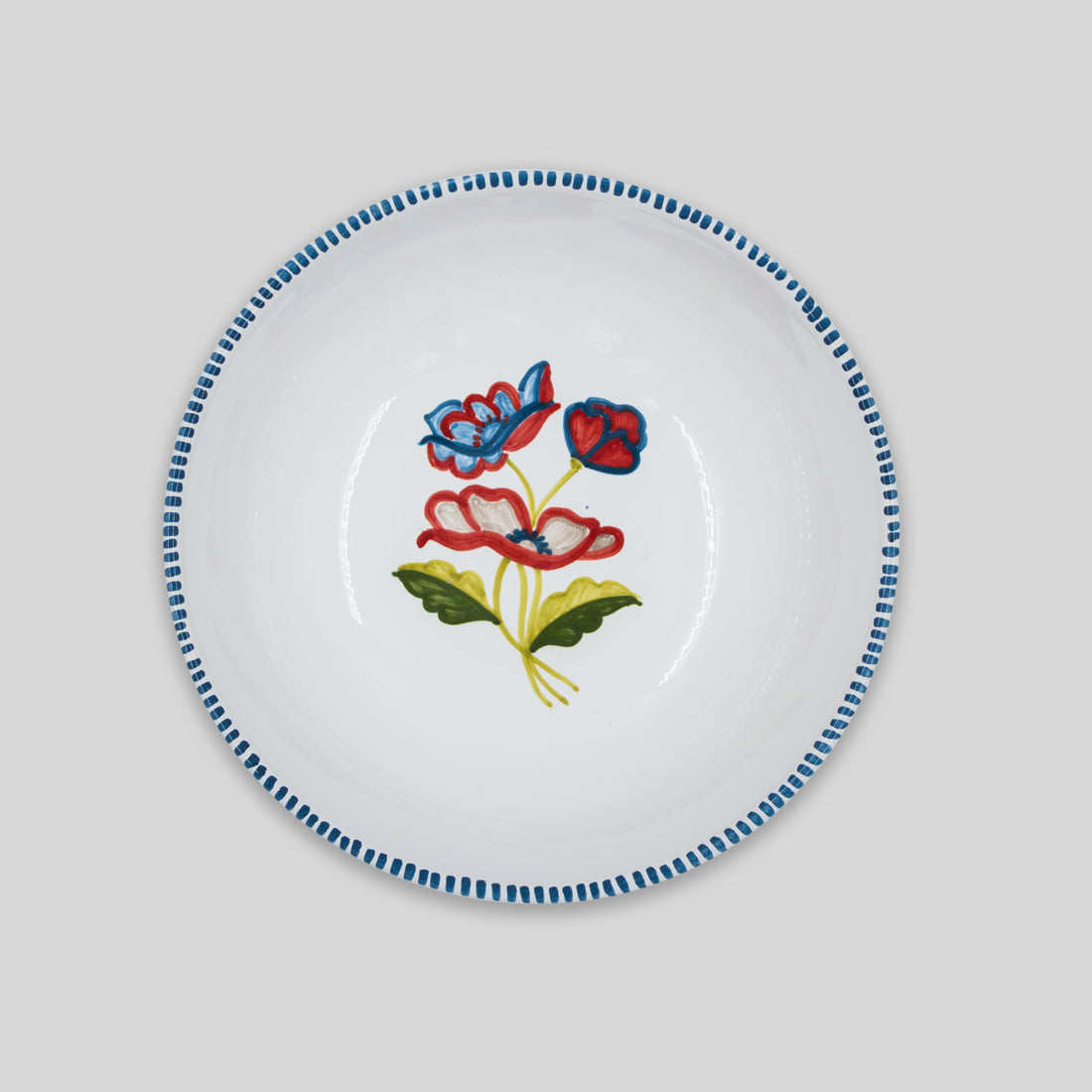 Cibelle embroiders the olive trees, vineyards, lemons, patterns and gardens of Puglia’s countryside to tell the stories of its landscapes and people through their table linens. Using 100% Italian linen and gorgeous embroideries, hand-crafted at every step, each Cibelle piece speaks to its founder Raffaella Gemiti’s mission to combine the craft, culture, and natural beauty of her homeland in unsurpassed table settings. The Piato Flat Plate, 28cm features a hand-painted, artful design of happy florals. We love this plate under your soup bowl, or for your favorite sides, pastas, salad, and more.