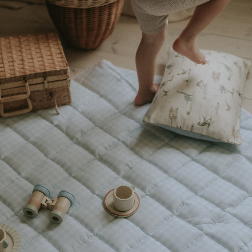 Inspired by Hygge—a Scandinavian concept that emphasizes the innate contentment arising from a cozy and comfortable atmosphere—Gooselings offers serene essentials for children and babies that bring stylish serenity to any space they touch. The Picnic Gingham Play Mat in Blue provides a soft, welcoming surface for tummy time, interactive play, and moments of discovery. Its classic gingham design adds timeless charm to the nursery while ensuring comfort and support for little ones at every stage.