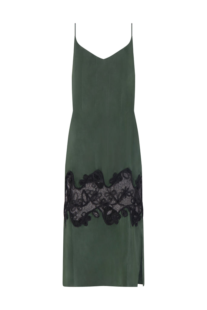 100% cupro. Hand-applied lace inlay. Unlined. Made in Italy.