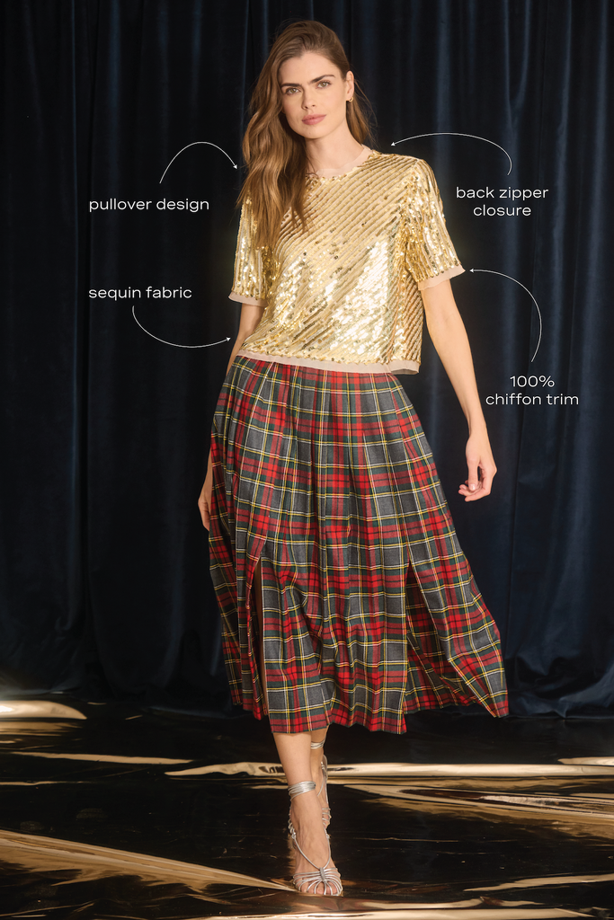 The Pixie Top in Gold reimagines the classic T-shirt with festive brilliance. Drenched in shimmering gold sequins, this showstopping piece is finished with soft chiffon trim at the neckline, sleeves, and hem—adding airy movement and refined contrast. Exquisitely crafted and effortlessly radiant, the Pixie Top is designed to dazzle from holiday soirées to celebratory nights out.