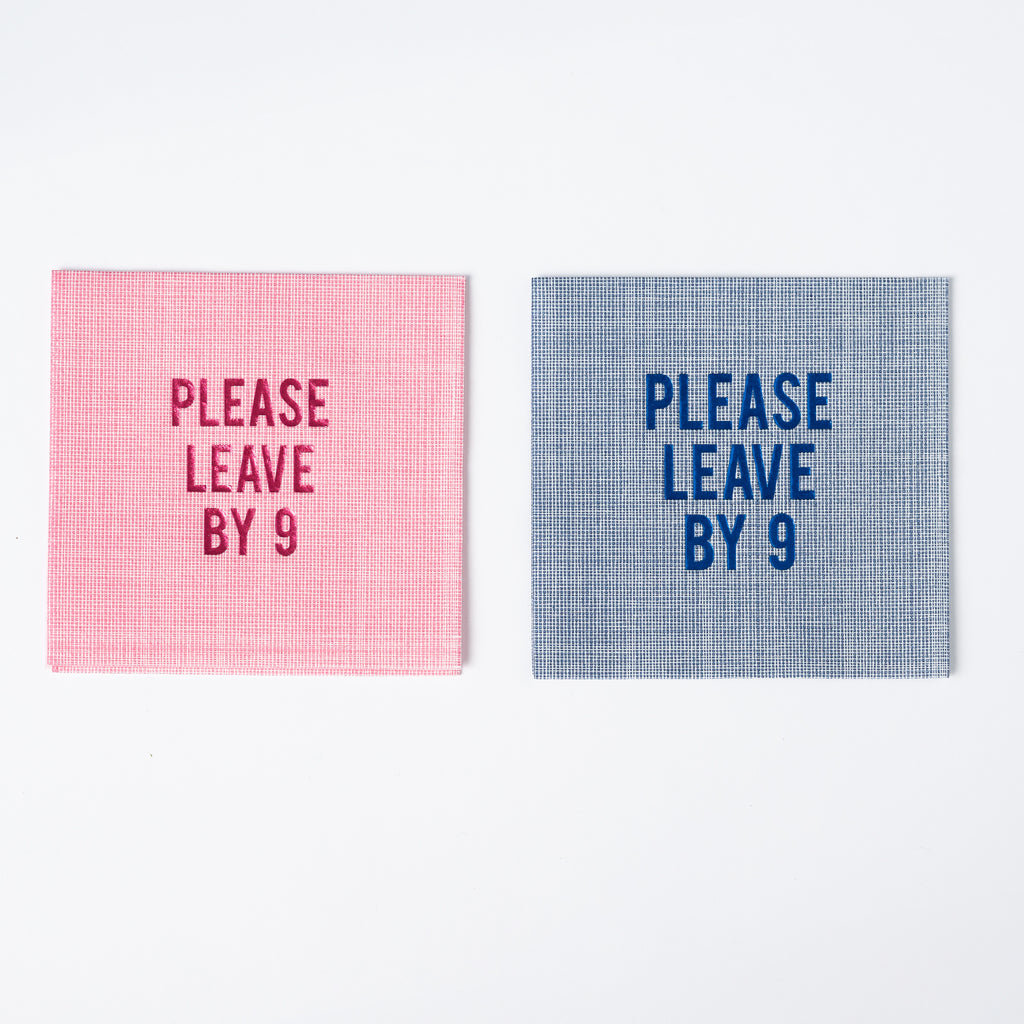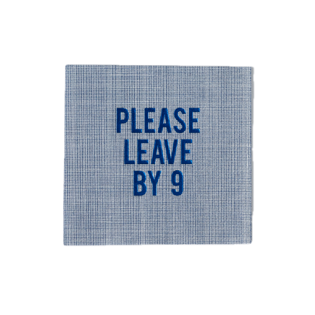 Our cult-favorite saying—now in luxe disposable form. The “Please Leave By 9” Disposable Napkins in Blue Linen, Set of 20, keep your gathering stylish and your schedule intact. Crafted from air-laid paper that mimics the look and feel of real linen, these witty cocktail napkins bring humor and sophistication to any occasion. Ideal for dinner parties, book clubs, or evenings that end fashionably early.