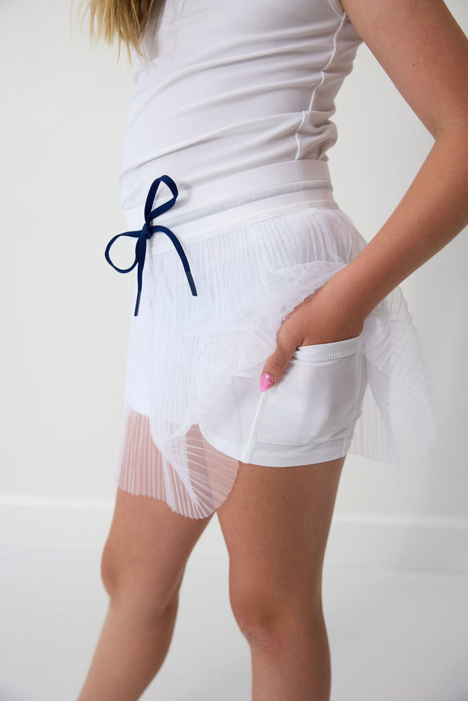 A polished blend of style and sport, Courtside Kids reimagines children’s activewear with performance fabrics, modern tailoring, and a classic athletic sensibility—made for everywhere from the playground to the country club. The Pleated Skort in White brings timeless tennis style to life with a modern performance edge. Featuring a tailored elastic waistband for a secure yet flexible fit and built-in anti-odor shorts with a convenient side pocket, this elevated essential keeps active girls comfortable and confident on and off the court.