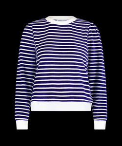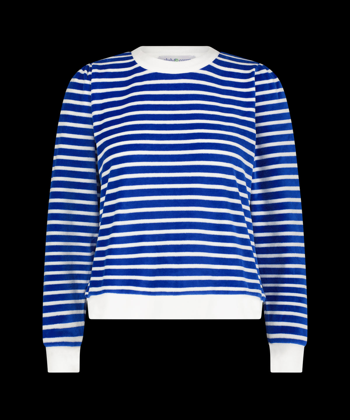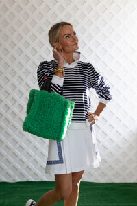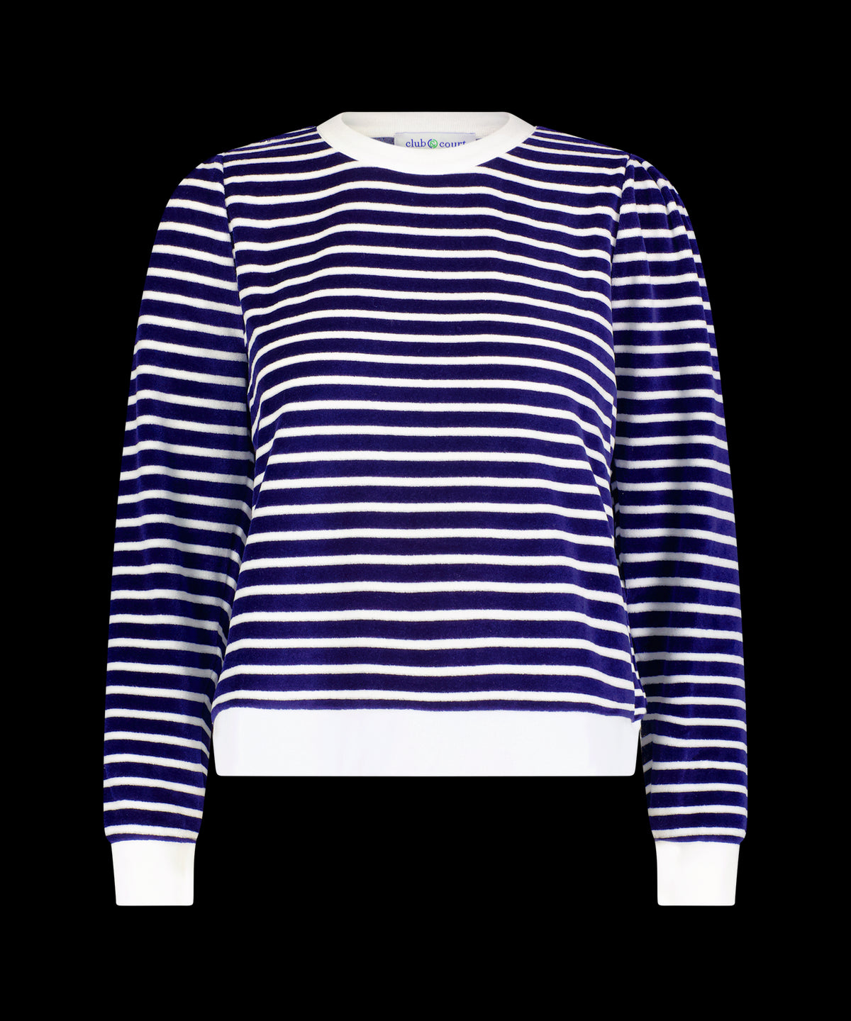 Taking inspiration from vintage tennis fashion, Club & Court employs modern fabrics and silhouettes, as well as a soft palette and bold prints to produce sporting attire, skirts and dresses that accommodate and elevate an active lifestyle. The bestselling Poppy Top blends sporty elegance with a touch of retro charm. Crafted from soft velour, this style features a feminine puff sleeve and comes in three classic colorways: Navy with Bright White Stripe, Cadet Blue with Bright White Stripe, and Bright White with Kelly Green Stripe.