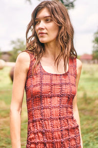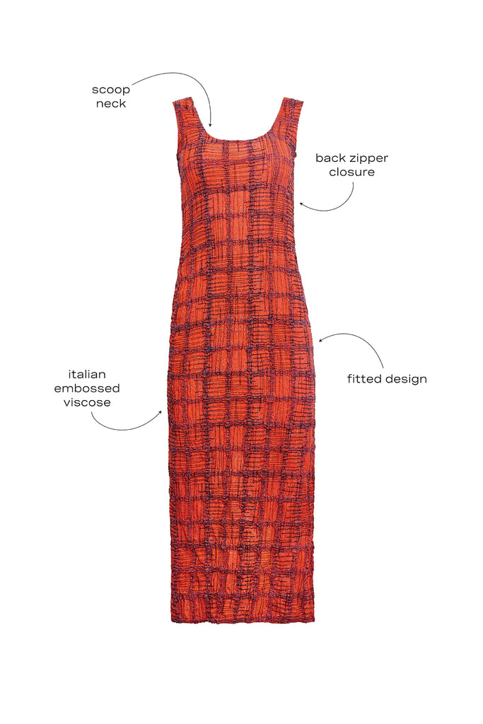 Hunter Bell strives to spark joy and inspiration with clothing that empowers women to embrace their personal style. The New York City–based label is all about fashion-forward, fun designs, crafted with meticulous detail and effortless wearability. The Portia Dress in Terracotta delivers sleek sophistication with its fitted tank silhouette and sculpted lines. Made from Italian embossed viscose with subtle stretch, this scoop-neck midi contours the body comfortably and flatters every movement. A back zipper closure completes the clean finish, making it a go-to for polished days and elegant evenings alike.