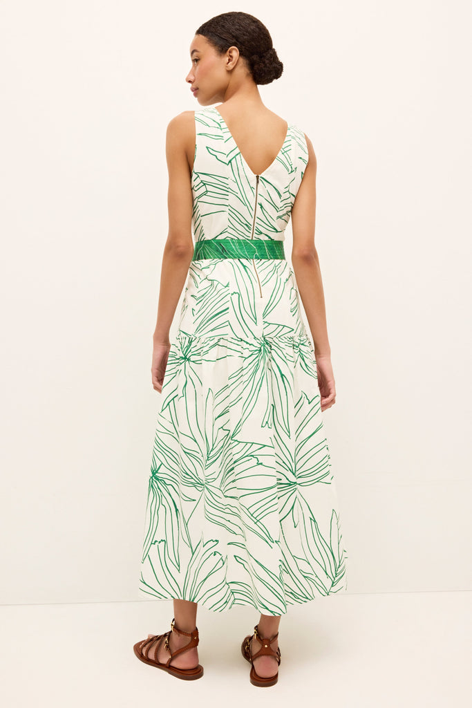 Empowering women through vivid hues and the joy of style, Sarah Doggett Evenson uses her archive of artistic prints, fine fabrics, and flattering silhouettes to make each Marie Oliver piece instantly uplifting. The Posey Dress in Palm features a new line-drawn, green-and-white botanical print that enlivens this simple yet universally flattering silhouette. It features a deep V-neck at both the front and back and an optional (and reversible!) trapunto stitch D-ring belt.