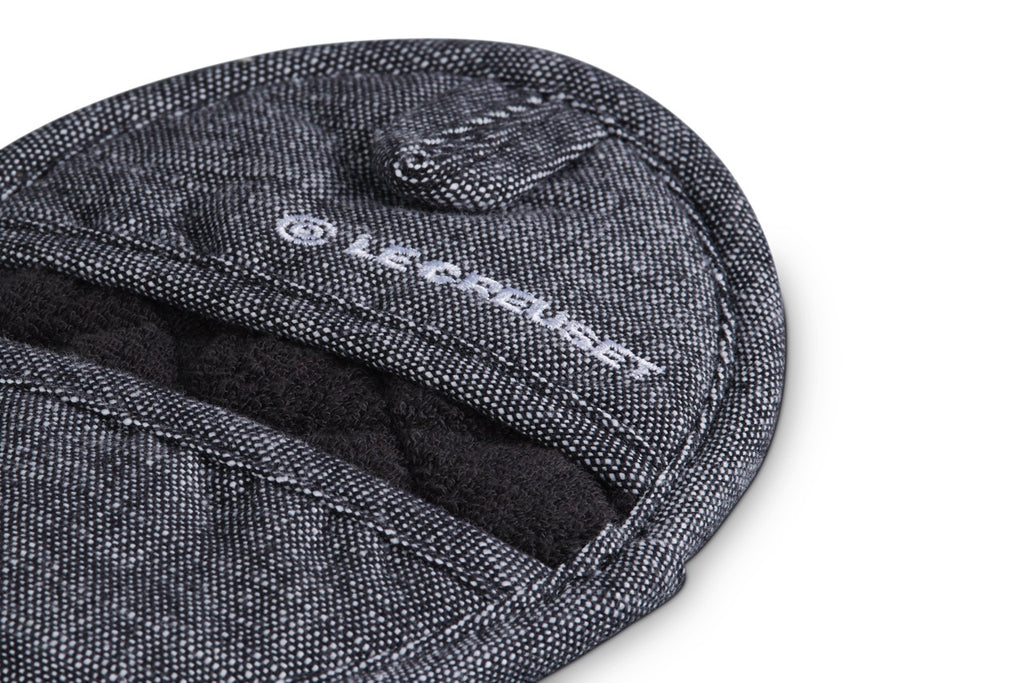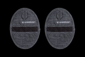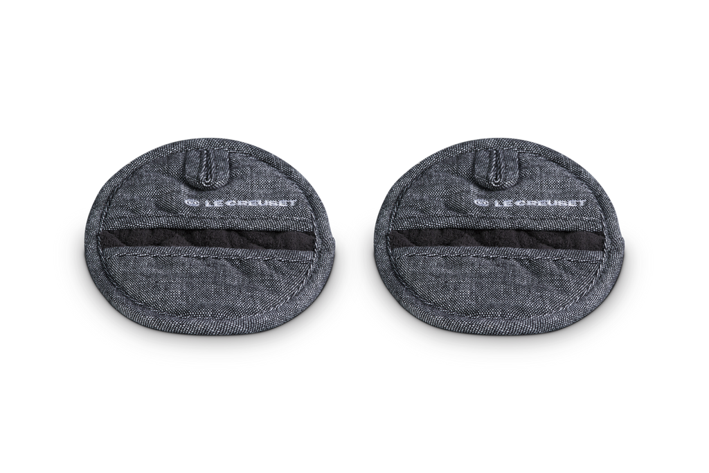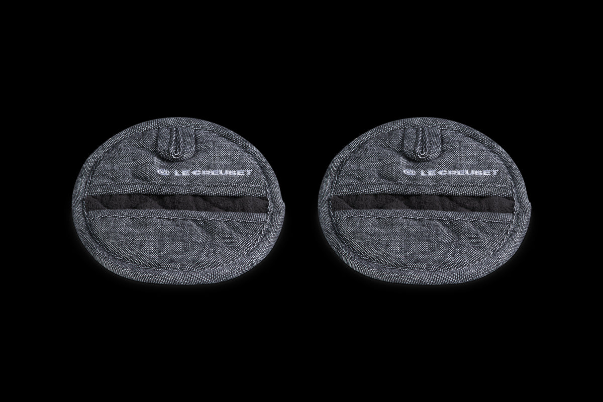 Recognized for its strength and durability, as well as its beauty and quality, Le Creuset produced the first enameled cast iron cookware nearly a century ago. A tradition of maintaining the finest culinary craftsmanship, combined with the latest innovations, means Le Creuset is known for blending classic form with real function and that it’s made for home cooks and professional chefs alike. Designed for safety and comfort, the Pot Grips Noir, Set of 2, provides a secure hold when handling hot cookware. Made from heat-resistant silicone with a soft terry cloth interior, these grips protect hands while offering flexibility and control during stovetop or oven use.