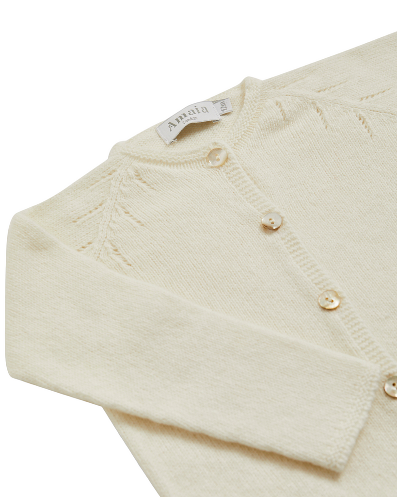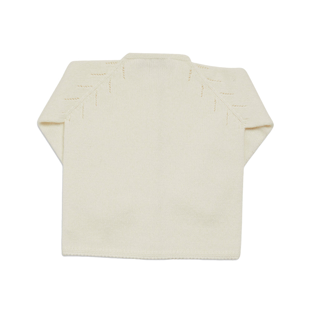The Puce Cardigan in Off White is a timeless layering piece that combines elegance and comfort. Crafted from a luxurious merino wool blend, it features delicate scalloped edging and a front closure of mother-of-pearl buttons. Soft, cozy, and beautifully detailed, this cardigan pairs effortlessly with Amaia’s hand-smocked dresses and classic separates for a refined finishing touch.