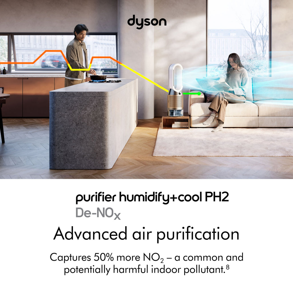 Founded in 1991 by James Dyson in England, the Dyson brand designs and manufactures household appliances—engineering solutions to everyday problems, from capturing dirt and air pollution to reducing hair damage. Each Dyson product is innovated to set new standards, spanning whole-home cleaning, healthier hair styling, and more. The Purifier Humidify + Cool De-Nox PH2 in White & Gold combines advanced air purification, humidification, and cooling in one sleek, high-performance machine. It automatically captures 50% more nitrogen dioxide (NO₂), removes 99.9% of bacteria from water, and uses a fully sealed 3-stage HEPA H13-grade filtration system to remove particles, odors, and gases while continuously destroying formaldehyde in spaces. The MyDyson app allows remote control and real-time air quality monitoring.