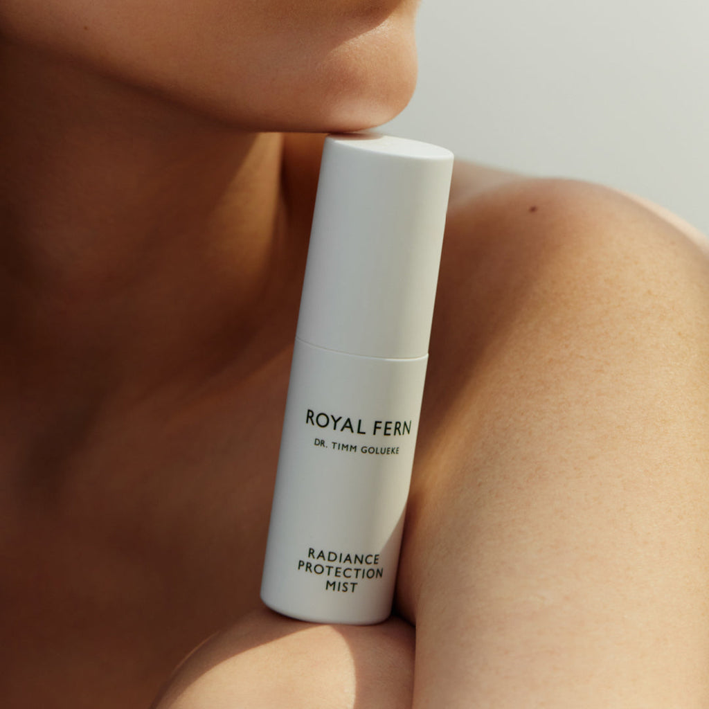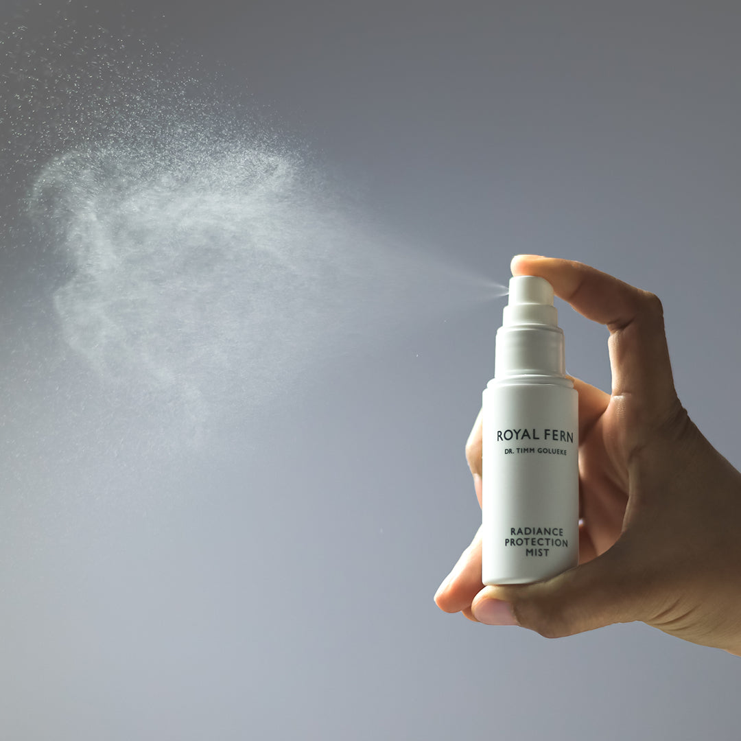 Royal Fern skincare sources ingredients from its namesake plant, which has survived for over 400 million years, staying evergreen, and resistant to UV radiation and environmental pollution. Harness its comprehensive protection mechanism and employ its cellular defense boosting properties with products at the intersection of nature’s wonder and cutting-edge cosmetic science. Whether your are looking for an extra boost of hydration & glow, protection against urban pollution and blue light, to illuminate your makeup or simply a refreshment, the Radiance Protection Mist has you covered. Used between your different skincare steps, it will maximizes the efficiency of your skincare products.