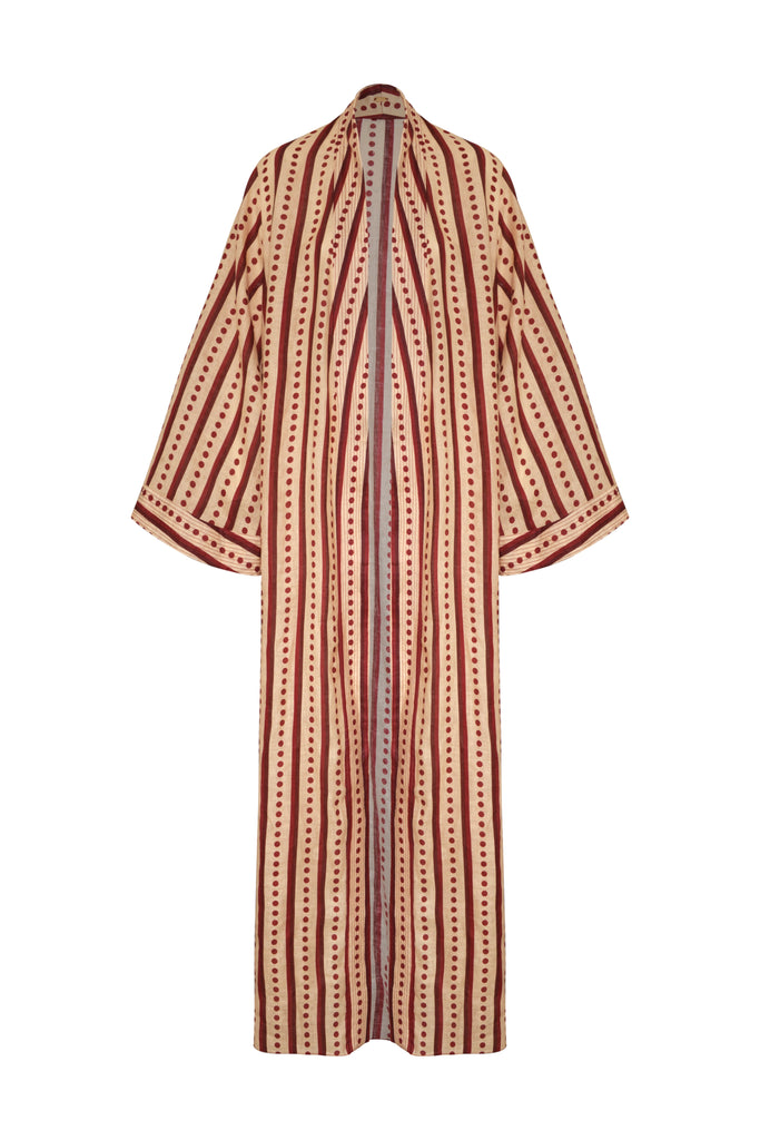 Founded in Cali, Colombia, Juan de Dios captures the essence of Latin American ease and sophistication through timeless resort silhouettes and artisanal detailing. The Rafaela Linen Kaftan in Red Stripes is a relaxed expression of effortless elegance, crafted from lightweight linen with a bold striped motif. Featuring wide sleeves, an open front, and tonal stitching along the placket and cuffs, it exudes understated refinement. The matching belt allows for versatile styling—worn loose for a breezy look or cinched at the waist for a more defined shape.