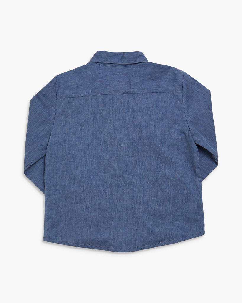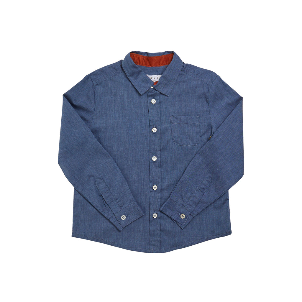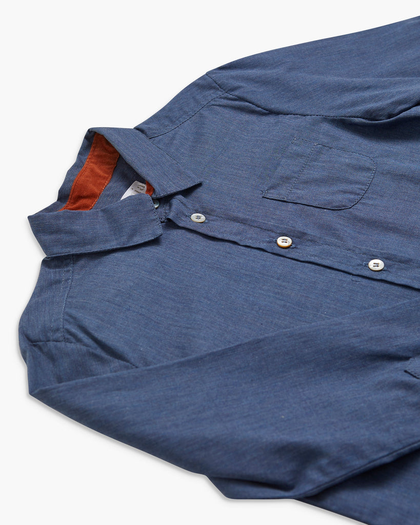 Soft chambray cotton. Classic collar. Front placket with mother-of-pearl buttons. Long sleeves with button cuffs. Made in Spain.