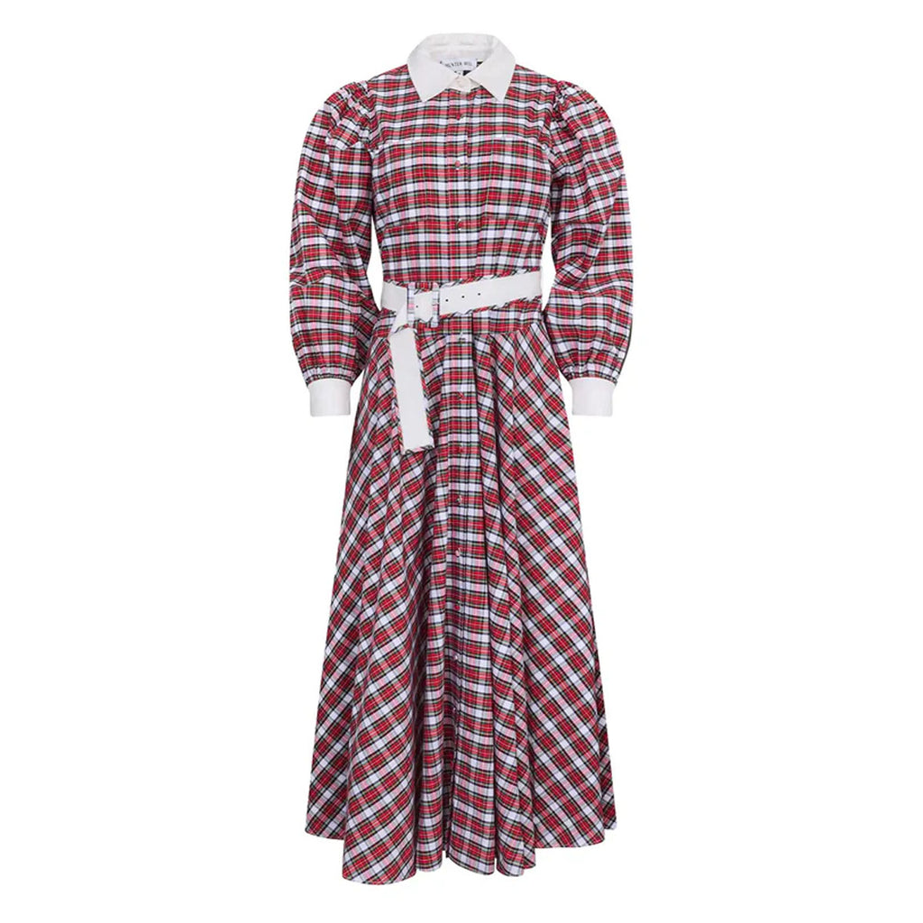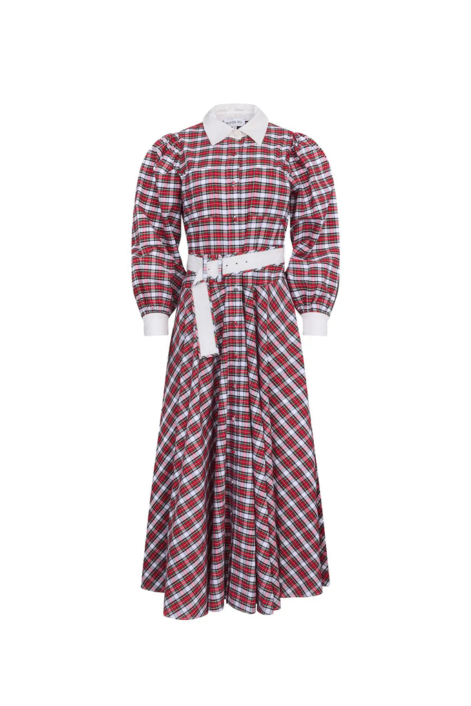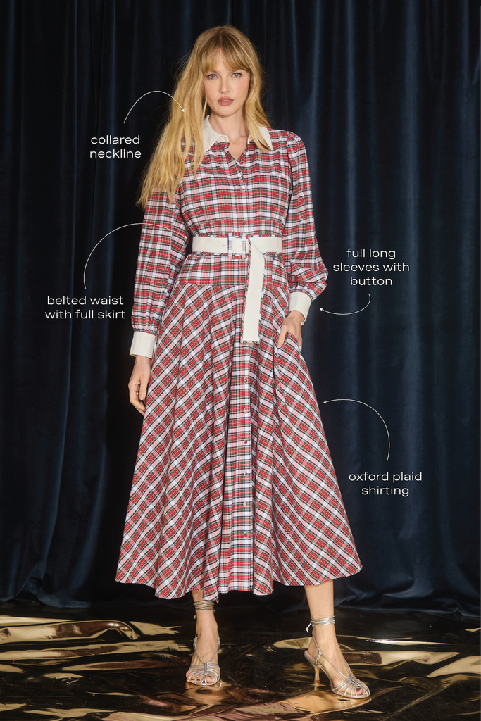 The Randolph Dress in Alpine Plaid brings star power to the classic shirtdress silhouette. Cut in bold plaid that marries crisp tailoring with fluid movement, it features a full-length button front, voluminous sleeves with button cuffs, and a dramatic sunburst circle skirt that flares beautifully with every step. An optional white cotton faille belt, edged with plaid piping and finished with a wrapped buckle and grommets, cinches the waist for a defined shape. Polished and statement-making, the Randolph Dress is a season-spanning staple destined to be worn on repeat.