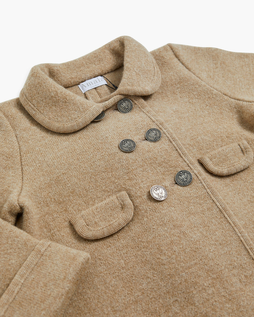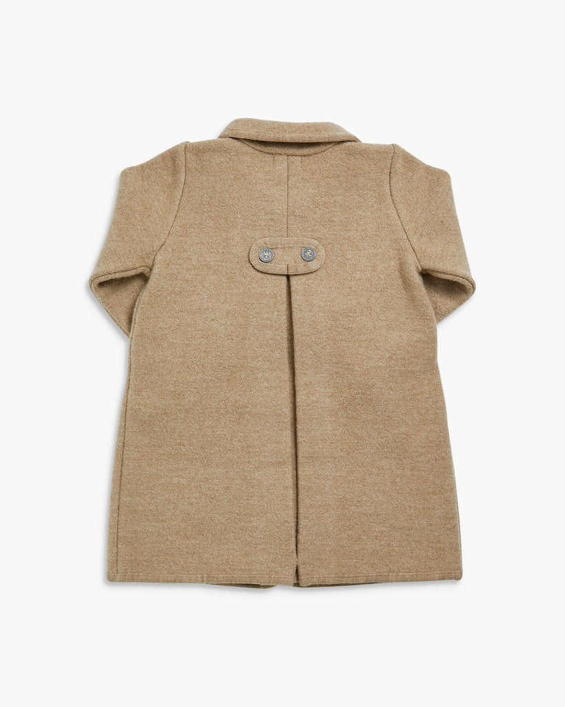 The Razorbil Coat in Beige captures timeless sophistication with its classic Austrian-inspired design, famously worn by Princess Charlotte. Expertly tailored from 100% boiled merino wool, it offers both warmth and structure. The coat features a notched collar with contrasting trim, a double-breasted front with brushed nickel buttons, and refined inverted pleats at the back for ease of movement. Two small front pockets add a practical touch. This heritage silhouette is the perfect balance of elegance and comfort—an heirloom-quality piece designed to keep little ones stylish all season long.