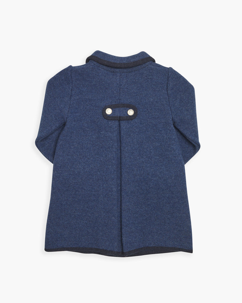 The Razorbil Coat in Blue captures timeless sophistication with its classic Austrian-inspired design, famously worn by Princess Charlotte. Expertly tailored from 100% boiled merino wool, it offers both warmth and structure. The coat features a notched collar with contrasting trim, a double-breasted front with brushed nickel buttons, and refined inverted pleats at the back for ease of movement. Two small front pockets add a practical touch. This heritage silhouette is the perfect balance of elegance and comfort—an heirloom-quality piece designed to keep little ones stylish all season long.