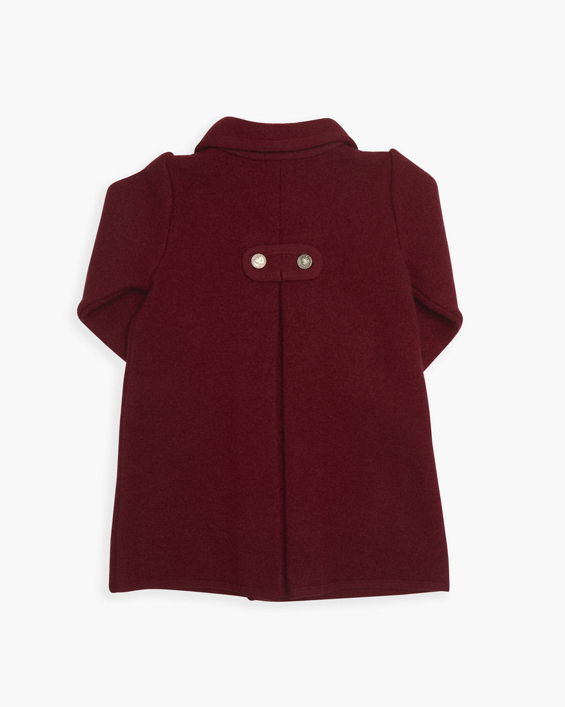 The Razorbil Coat in Burgundy captures timeless sophistication with its classic Austrian-inspired design, famously worn by Princess Charlotte. Expertly tailored from 100% boiled merino wool, it offers both warmth and structure. The coat features a notched collar with contrasting trim, a double-breasted front with brushed nickel buttons, and refined inverted pleats at the back for ease of movement. Two small front pockets add a practical touch. This heritage silhouette is the perfect balance of elegance and comfort—an heirloom-quality piece designed to keep little ones stylish all season long.