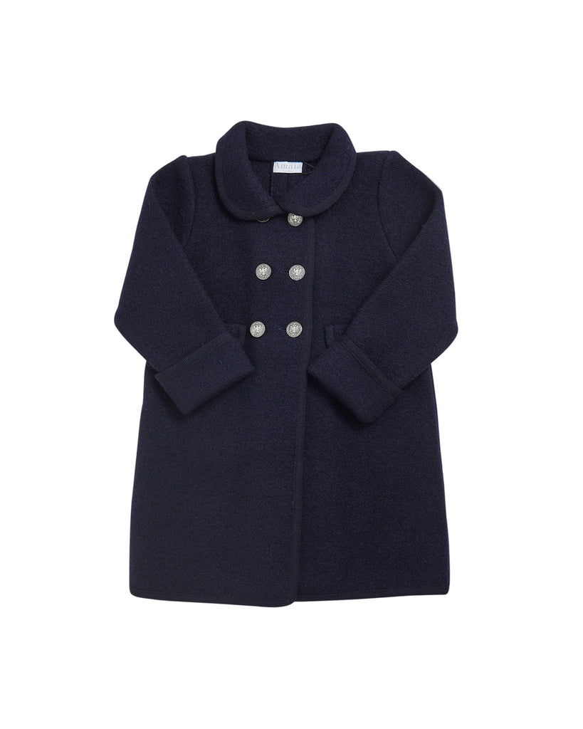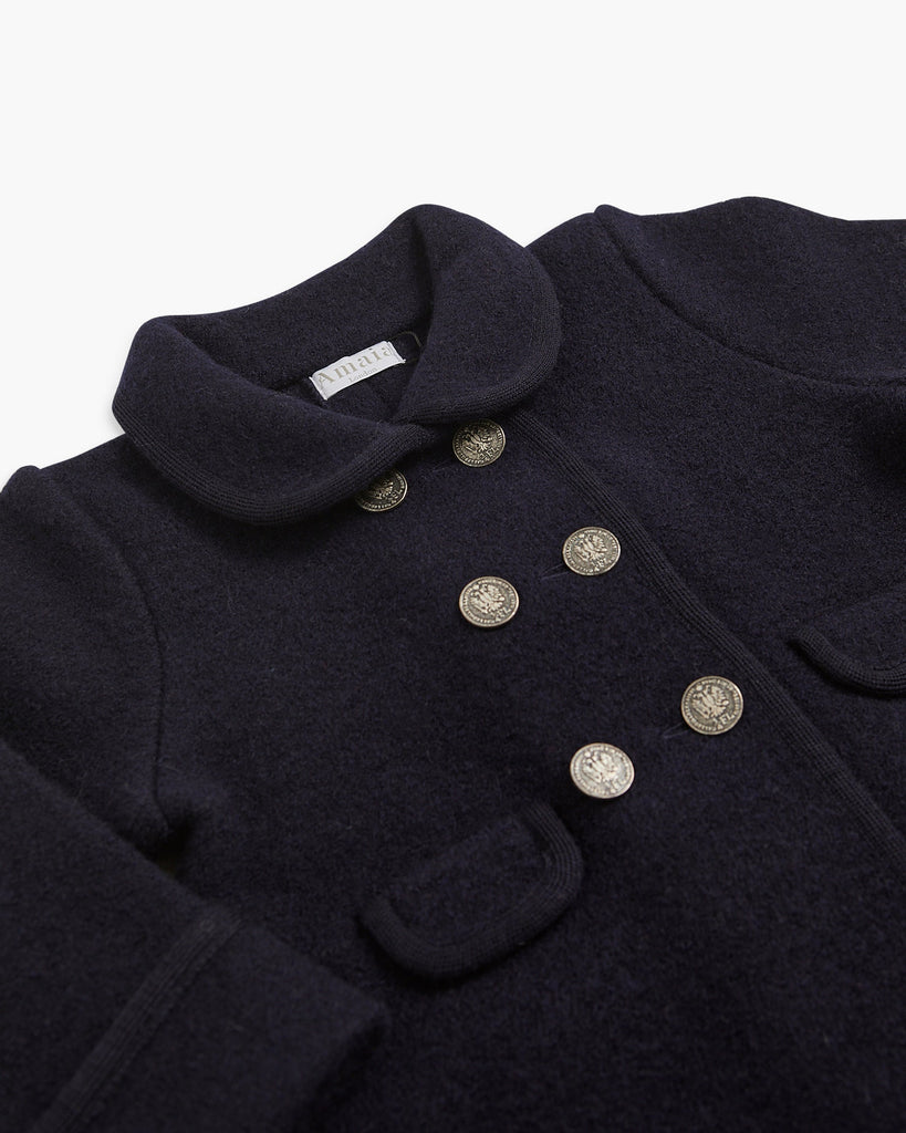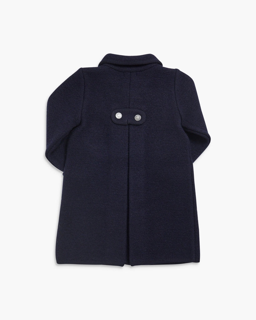 The Razorbil Coat in Navy captures timeless sophistication with its classic Austrian-inspired design, famously worn by Princess Charlotte. Expertly tailored from 100% boiled merino wool, it offers both warmth and structure. The coat features a notched collar with contrasting trim, a double-breasted front with brushed nickel buttons, and refined inverted pleats at the back for ease of movement. Two small front pockets add a practical touch. This heritage silhouette is the perfect balance of elegance and comfort—an heirloom-quality piece designed to keep little ones stylish all season long.