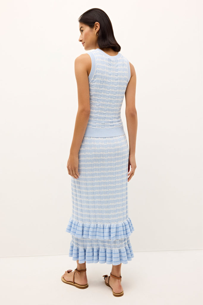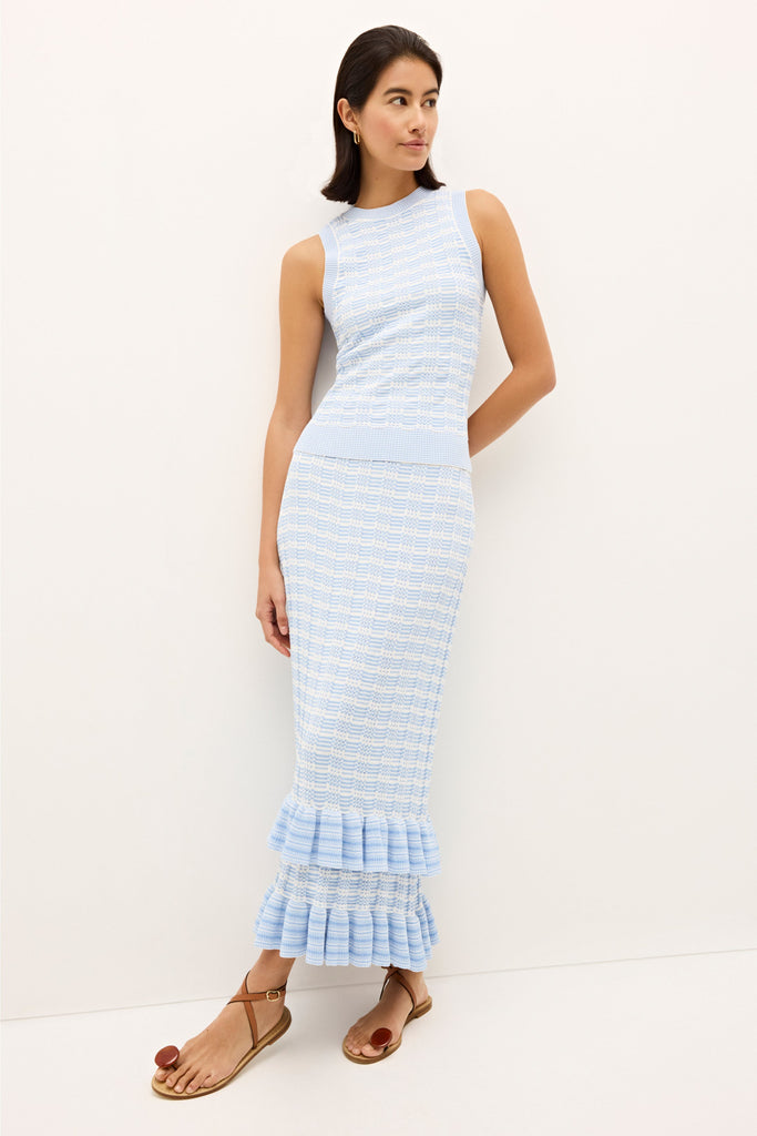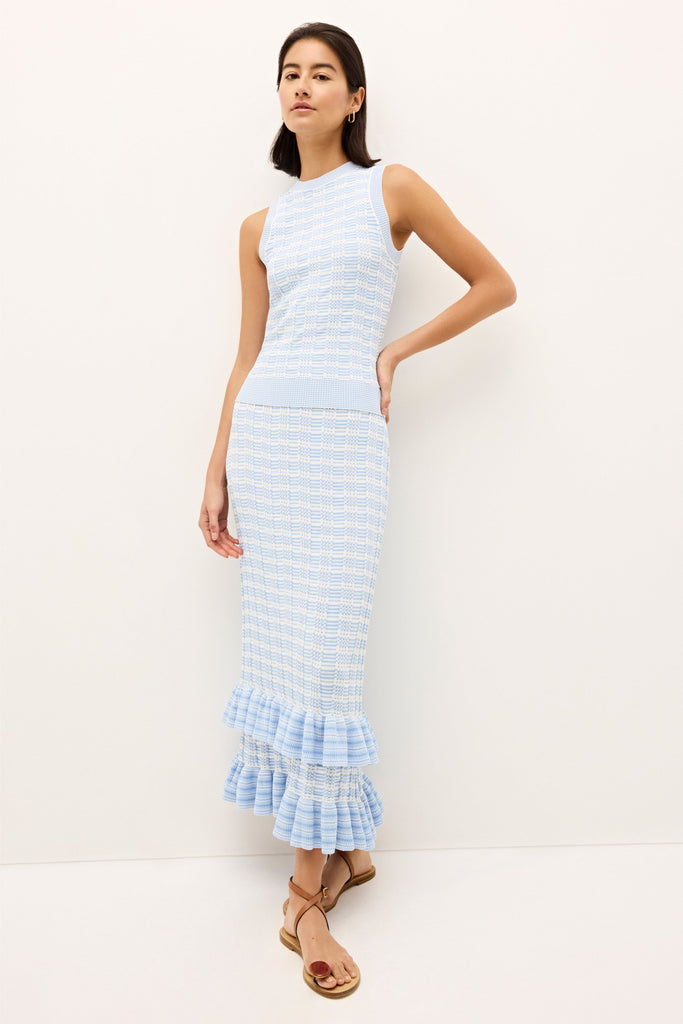 Empowering women through vivid hues and the joy of style, Sarah Doggett Evenson uses her archive of artistic prints, fine fabrics, and flattering silhouettes to make each Marie Oliver piece instantly uplifting. The Reece Top in Cruise has a sleek crew-neck silhouette that is cut from a soft, blue-and-white-striped knit. The striped rib fabric creates a flattering body skimming fit.