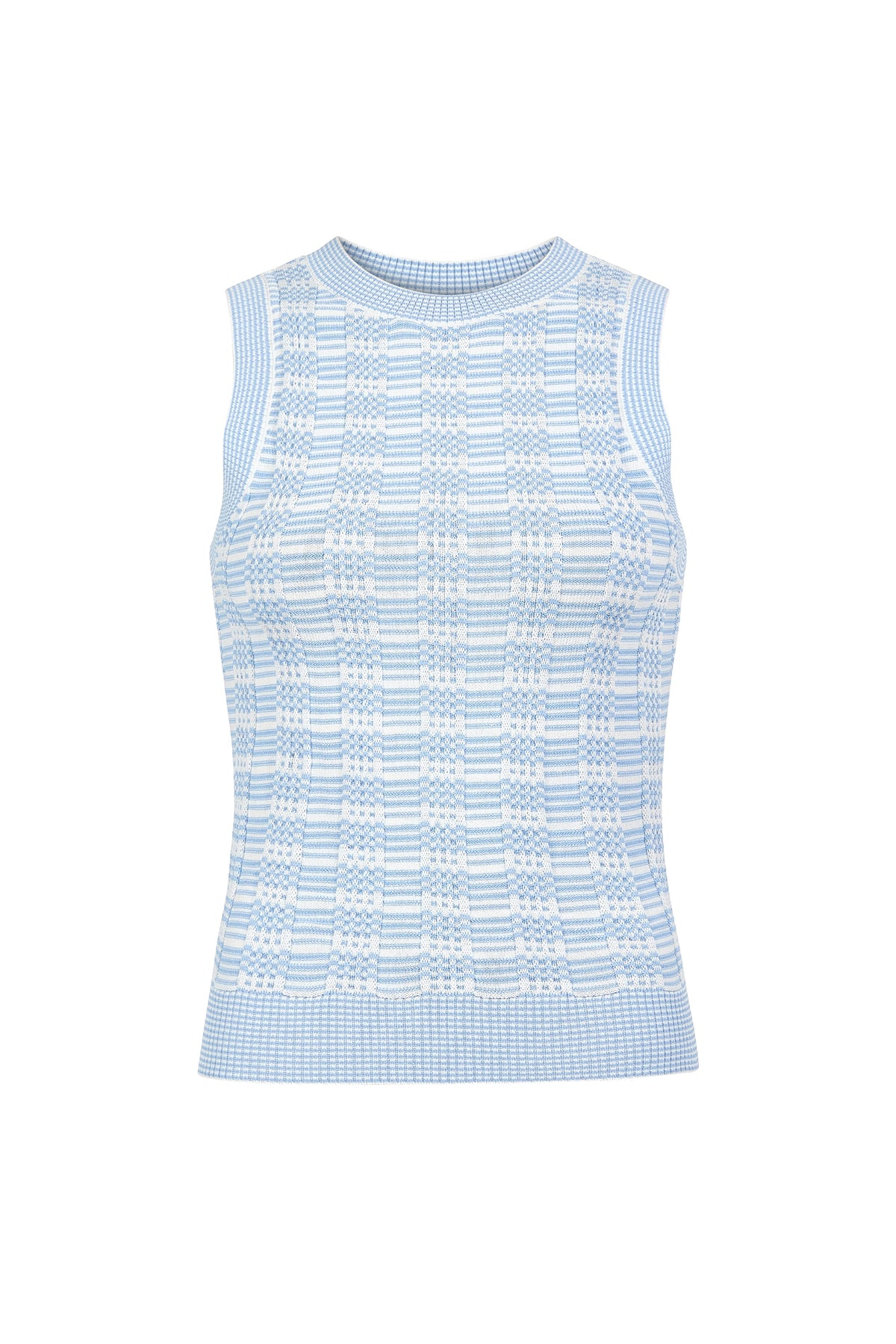 63% ecojilin viscose, 37% recycled nylon. Unlined. Crew neck slip on silhouette. Striped rib knit fabric. Body skimming fit.