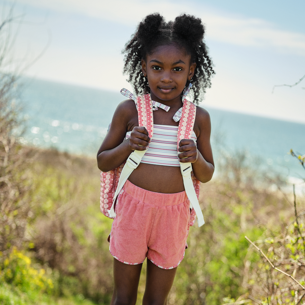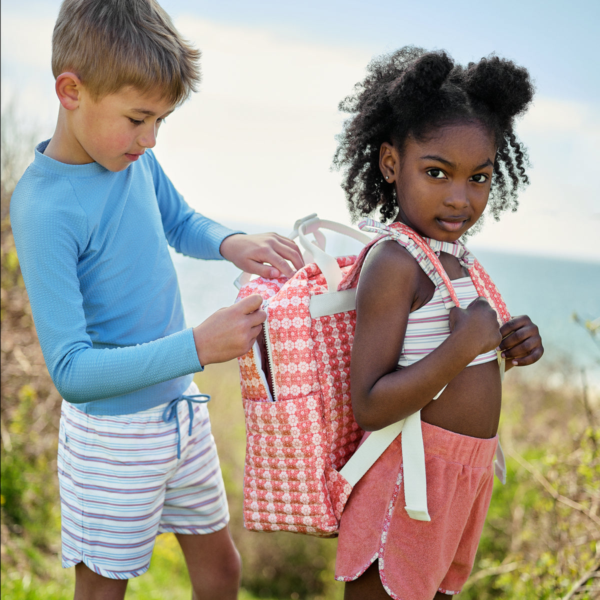 A family favorite for its clean lines and simple details, minnow creates pieces that are playful, polished, and thoughtfully designed for long days, sandy toes, and the wonderment of life on the shore. Updated in a new water-repellent coating on the outside, the Regatta Red Paisley Coated Everyday Backpack is made for their little on-the-go lifestyles. Equipped with padded shoulder straps and convenient top-carry handles, as well as a spacious lined interior, two side pockets and a zippered front pocket, it’s the ideal companion for every adventure.