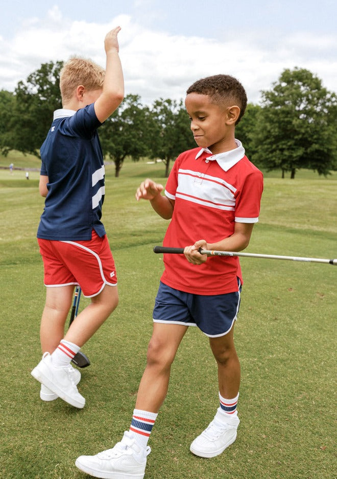 A polished blend of style and sport, Courtside Kids reimagines children’s activewear with performance fabrics, modern tailoring, and a classic athletic sensibility—made for everywhere from the playground to the country club. The Retro Super Short in Red with White Piping brings a nostalgic twist to the brand’s signature Super Short silhouette. Crafted from a custom, ultra-soft performance fabric with four-way stretch, it features a built-in liner with anti-odor protection, contrast piping, and side pockets for collecting treasures of every kind. With a modern above-the-knee cut, these sporty shorts deliver both style and comfort for boys on the move.