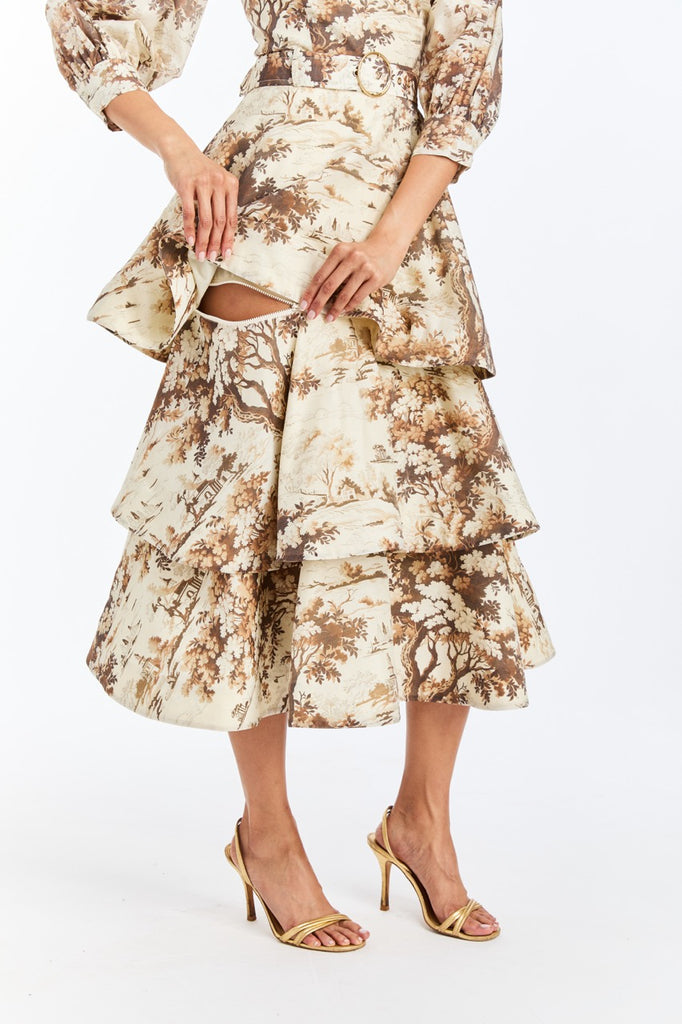 Welcome to the enchanting world of Mestiza New York, where heritage meets haute couture. Founded by Alessandra Perez-Rubio & Louisa Rechter Takacs, this brand is a tribute to their shared Filipino roots and the timeless elegance of their foremothers. Each piece, crafted with the highest quality to stand the test of time, will add polish to your wardrobe, and a touch of magic, too. The Rhonda Convertible Midi Dress in Chestnut Toile embodies the brand’s spirit of versatility and refined romance. Cut from linen organza, this tiered silhouette transitions effortlessly between midi and mini lengths with a hidden zipper in the skirt. Princess seams and a defined waist ensure a secure, flattering fit, while side seam pockets add ease. Finished with horsehair in the lining for volume and a graceful flared shape, this fully lined design offers polished elegance with adaptable charm.