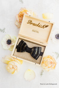 Brackish began with one feather bow tie designed by Ben Ross and gifted to his groomsman, Jeff Plotner. Since its inception, the brand has blossomed into a full line of men’s and women’s accessories designed and handcrafted in Charleston, South Carolina with each piece focused on honoring the beauty found in nature. The Rice Bow Tie is the black counterpart to the all white Carew style. Named after Carew Rice, a South Carolina artist who used black and white silhouettes to imitate the world around him. This piece is made from black goose feathers.