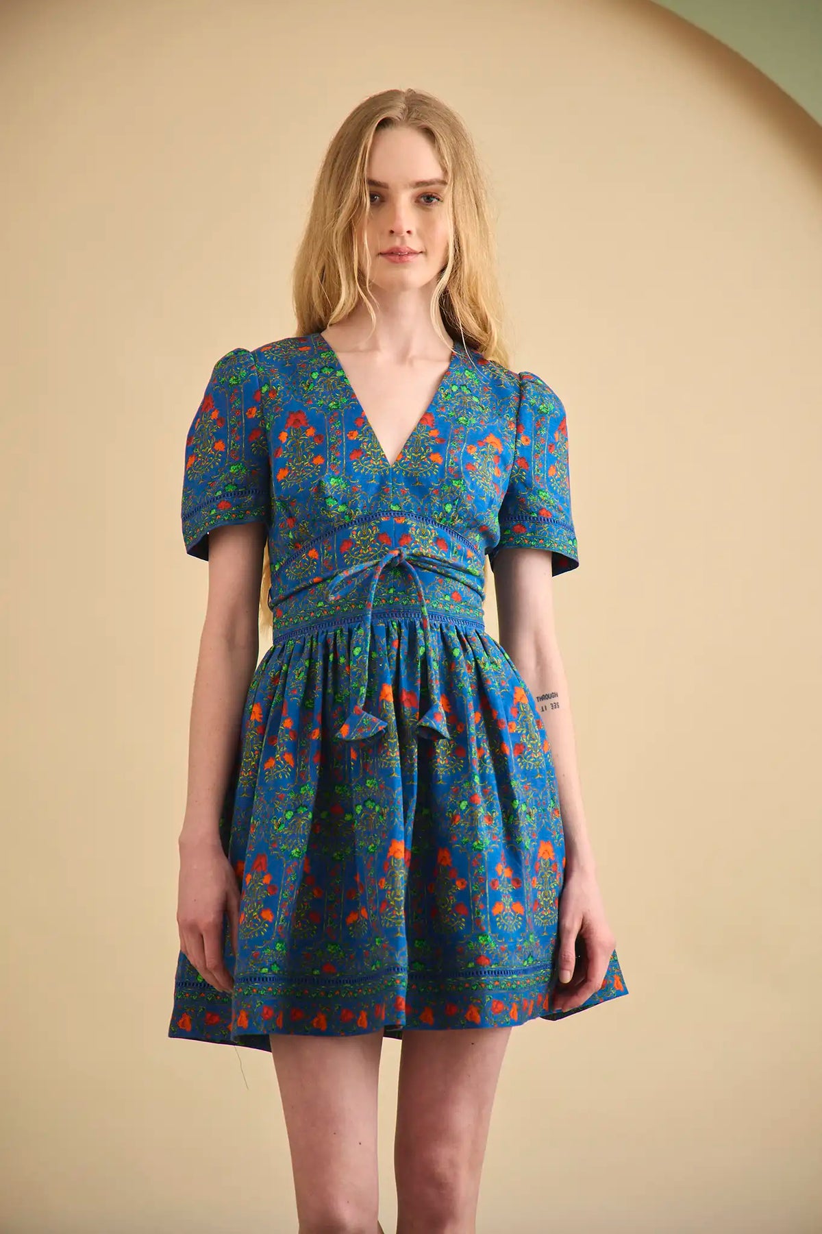 100% cotton. Lining: 53% linen, 47% rayon. Lightweight linen blend. Fitted bodice with V-neckline. Short sleeves. Full mini skirt. Hidden back zipper. 34.5" length from top of shoulder.