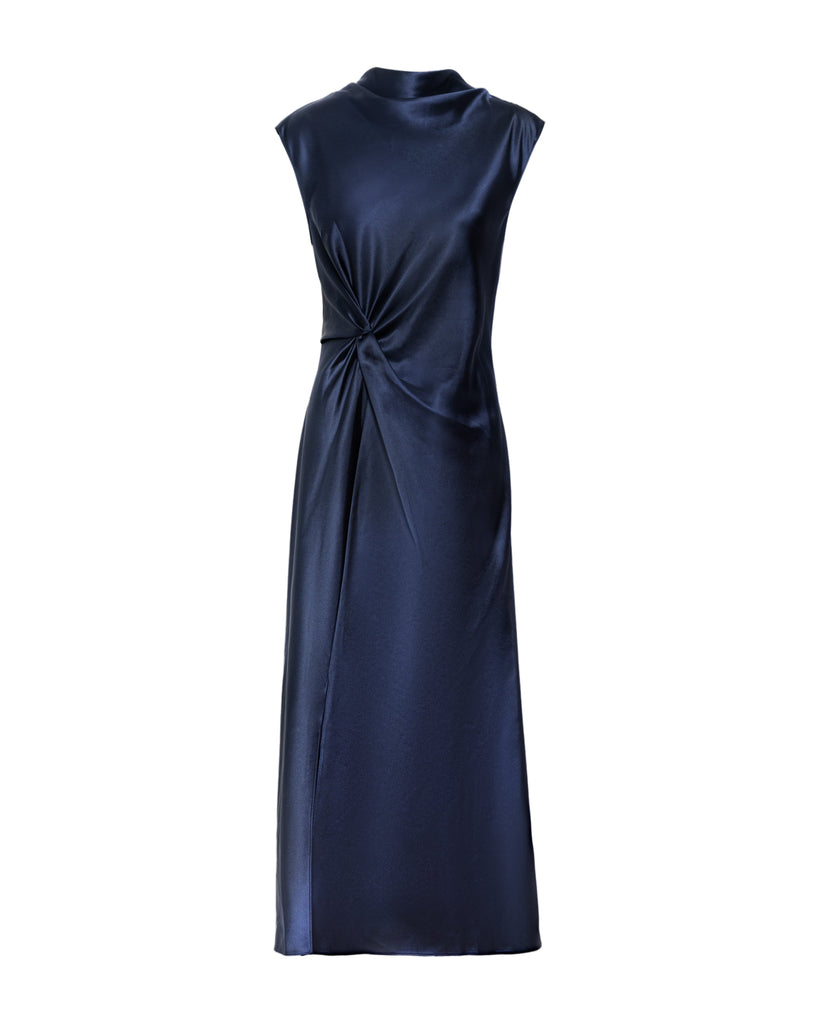 Satin crepe. Bias-cut silhouette. Twist detail at waist. Cap sleeves. Midi length. Concealed side zip closure. Unlined.