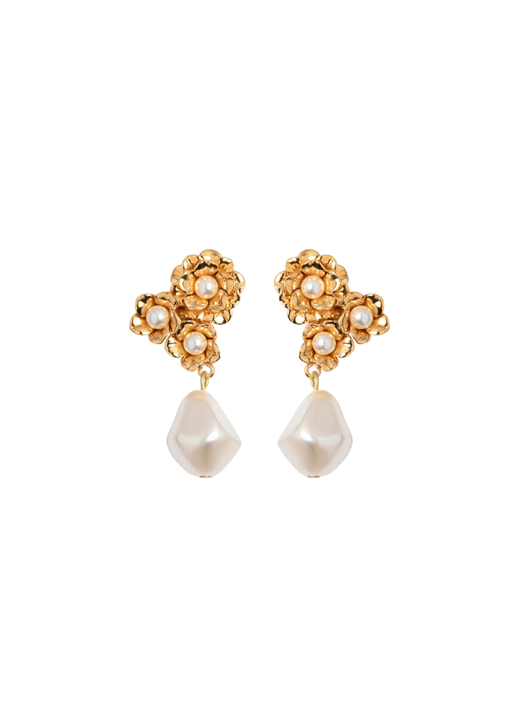 “Everything has a story to tell,” says Jennifer Behr, the founder of her namesake luxury hair accessory brand that has blossomed into one of New York City’s foremost ateliers for jewelry, as well as bridal. In every crystal, pearl, and ribbon, you’ll find the utmost quality and a sense of romance, as each piece reveals a modern interpretation of centuries-old regalia. The Romina Earrings in Gold capture the graceful spirit of Viennese Art Nouveau with their flowing, organic lines and delicate floral detailing. Handcrafted in New York, each drop features a trio of 18K gold-plated blossoms accented by Austrian crystal pearls, finished with a baroque-style pearl drop that moves with timeless elegance.