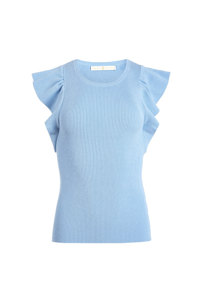 Empowering women through vivid hues and the joy of style, Sarah Doggett Evenson uses her archive of artistic prints, fine fabrics, and flattering silhouettes to make each Marie Oliver piece instantly uplifting. A ribbed bodice and ruffle sleeves elevate the stylish Rory Top in Sky. The figure-flattering top pairs well with high or mid-rise shorts, especially Mia.