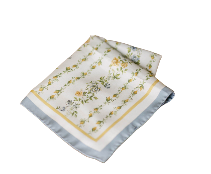 Imbued with romantic imagery and sumptuous patterns, Nadia & Co. creates beautiful products that turn little moments into decadent memories. Toronto-based artist and tastemaker, Nadia Colella, has perfected her craft with over fifteen years of industry experience. The Rosa Silk Scarf showcases linear rosettes in cheerful shades of yellow and soft dusty blues, making it an elegant accent worn draped, wrapped, or tied to a favorite handbag.
