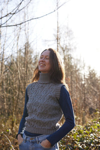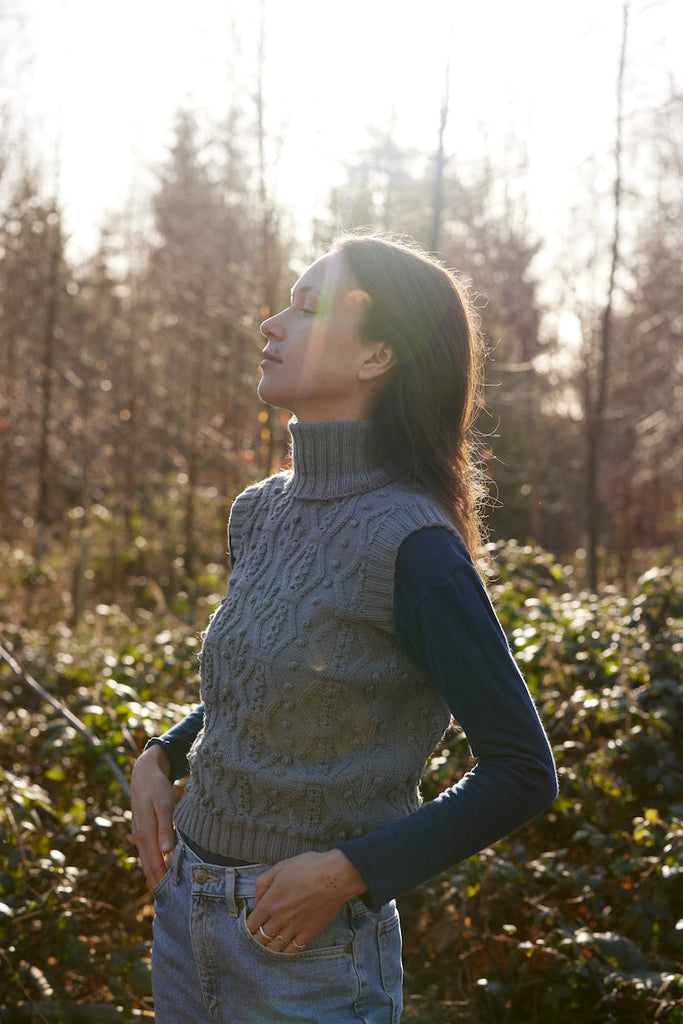 From her studio in France, Michaela Buerger brings a contemporary lens to the rich cultural knitting traditions of her Austrian homeland, designing ultra-feminine, high-quality, everlasting pieces, handmade in partnership with communities of women across Eastern Europe. Crafted from soft, high quality merino wool, the sophisticated cable knit Rosa Vest features charming charling flower embroidery around the neckline.