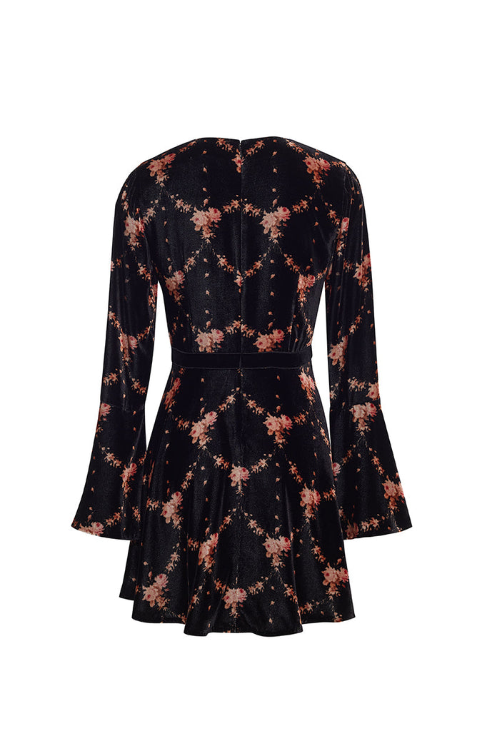 Crewneck A-line mini dress in Trellis Black printed fabric. Bell sleeves. Velvet tape tie at waist with tacked bow detail. Center back invisible zipper with hook-and-eye closure. Bodice lined. Allover print.