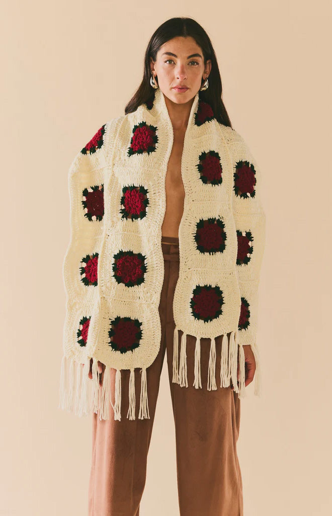 Tomboy looks, girly-girl styles, and an always fashionable approach define EDDY’s aesthetic. With a focus on bold and feminine silhouettes, EDDY dresses and tops pair elevated California bohemian with global inspiration; these are clothes designed to make you feel good inside and out. Inspired by a vintage treasure and reimagined in hand-crocheted wool, the rosette Round Top Rose Scarf features blooming “granny” squares across an ivory ground, finished with swingy fringe for playful movement. Generously sized, it can be styled as a wrap, scarf, or cozy shoulder throw—an heirloom-quality layer with effortless versatility.